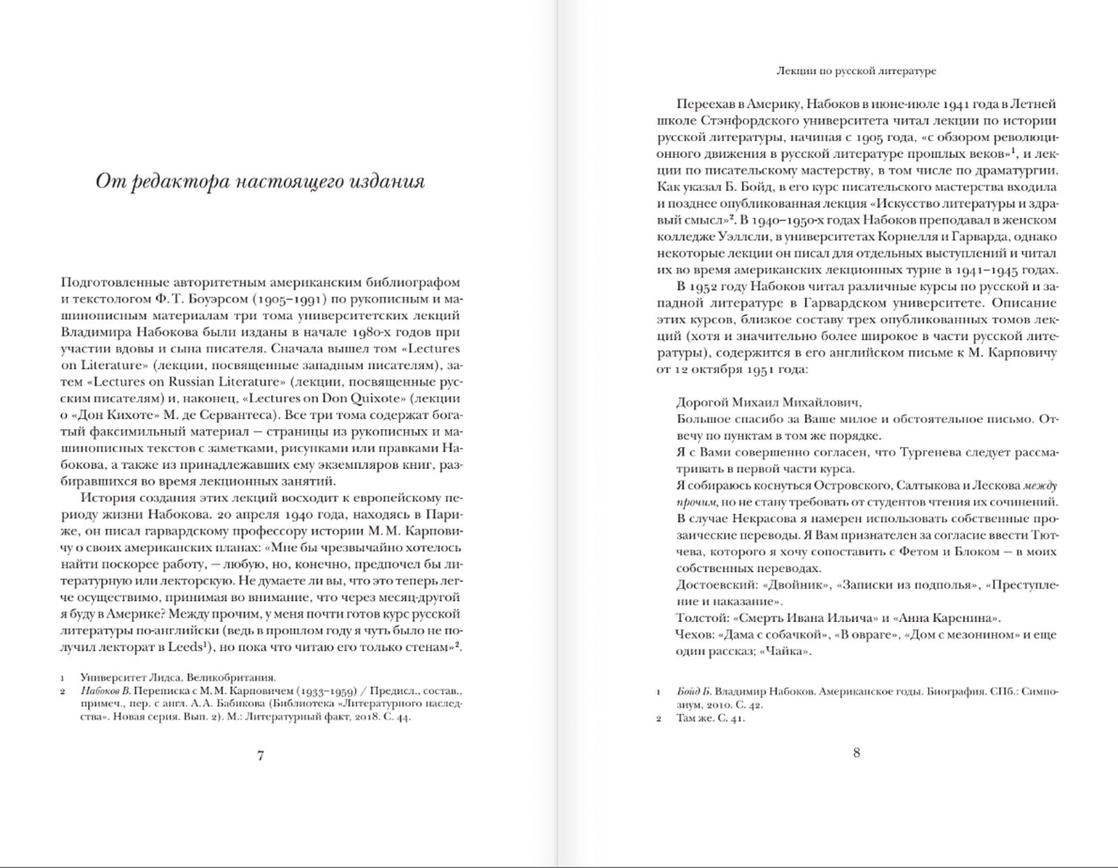 В начале 1980-х годов благодаря усилиям наследников Владимира Набокова и американского текстолога Ф. Боуэрса читателям открылась новая грань многообразного дарования знаменитого автора «Лолиты» и «Ады». Собранные в три тома университетские лекции Набокова по русской и европейской литературе, прочитанные в Уэллсли, Корнелле и Гарварде в 1940–1950 гг., не только раскрывали западной аудитории большой и яркий мир Гоголя, Тургенева, Толстого, Достоевского, Чехова и в новом свете представляли Диккенса, Флобера, Пруста, Кафку и Джойса, но и удивительным образом дополнили писательский образ самого Набокова. Прочтение лекций Набокова, сочетающих биографические очерки с детальными разборами и оригинальными трактовками знаменитых произведений, стало необходимым условием проникновения в творческое сознание гениального писателя и в саму сущность того, что зовется искусством литературы.