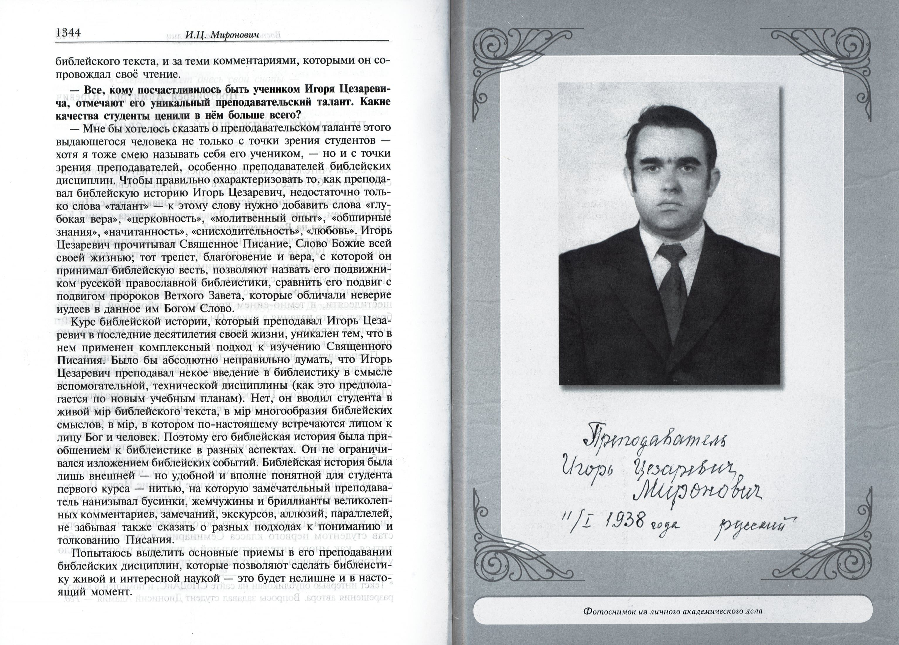 Автор известного и любимого студентами Духовных Учебных заведений Северной столицы Курса лекций по Библейской истории, доцент Санкт-Петербургских Духовных Академии и Семинарии Игорь Цезаревич Миронович более сорока лет преподавал в 1-м классе Санкт-Петербургской Духовной Семинарии, а с 1993 года также и на Свято-Иоанновских Богословских курсах.