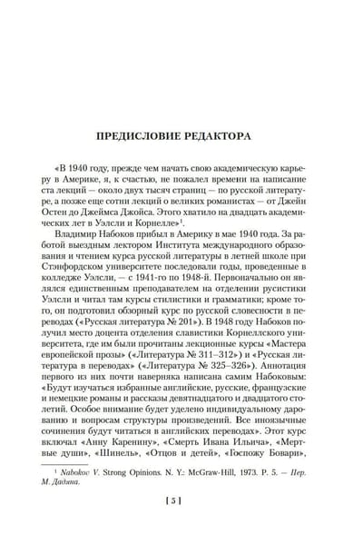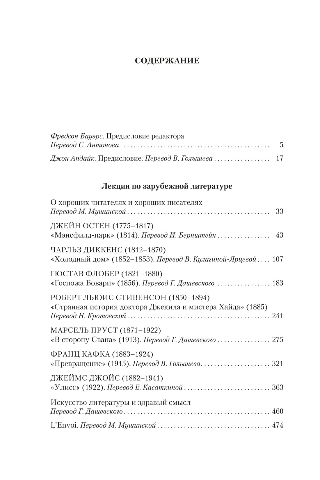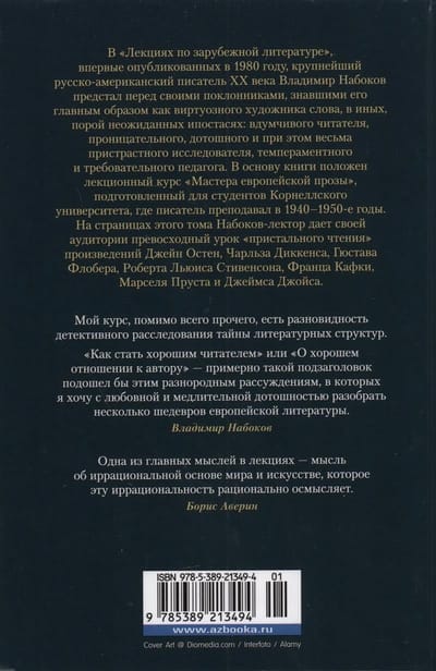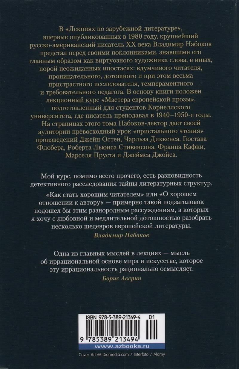 В «Лекциях по зарубежной литературе», впервые опубликованных в 1980 году, крупнейший русско-американский писатель ХХ века Владимир Набоков предстал перед своими поклонниками, знавшими его главным образом как виртуозного художника слова, в иных, порой неожиданных ипостасях: вдумчивого читателя, проницательного, дотошного и при этом весьма пристрастного исследователя, темпераментного и требовательного педагога. В основу книги положен лекционный курс «Мастера европейской прозы», подготовленный для студентов Корнеллского университета, где писатель преподавал в 1940–1950-е годы. На страницах этого тома Набоков-лектор дает своей аудитории превосходный урок «пристального чтения» произведений Джейн Остен, Чарльза Диккенса, Гюстава Флобера, Роберта Льюиса Стивенсона, Франца Кафки, Марселя Пруста и Джеймса Джойса.