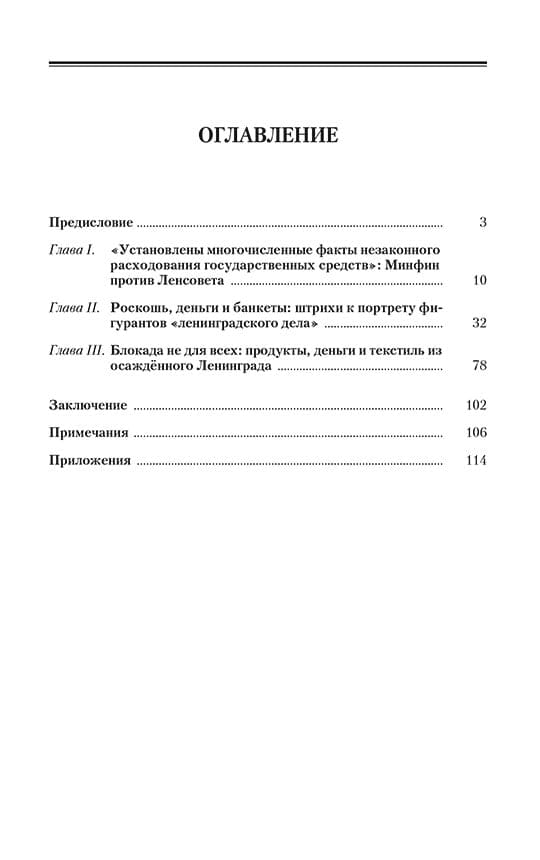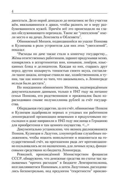 В монографии рассмотрены обвинения фигурантов «ленинградского дела» в использовании служебного положения в личных целях. В ходе проверок, проводившихся в Ленинграде сотрудниками финансовых органов, партконтроля, госконтроля и других партийных и государственных органов власти, были выявлены многочисленные факты незаконного расходования государственных средств и материальных ресурсов. Среди них – приобретение за государственный счёт предметов роскоши в блокадном Ленинграде, а также трофейного имущества в Германии. Кроме того, устройство банкетов в тяжёлое военное и послевоенное время, «разбазаривание» продуктов питания в период блокады, вывоз из блокадного Ленинграда продуктов питания и текстиля для обеспечения эвакуированных семей руководителей города.