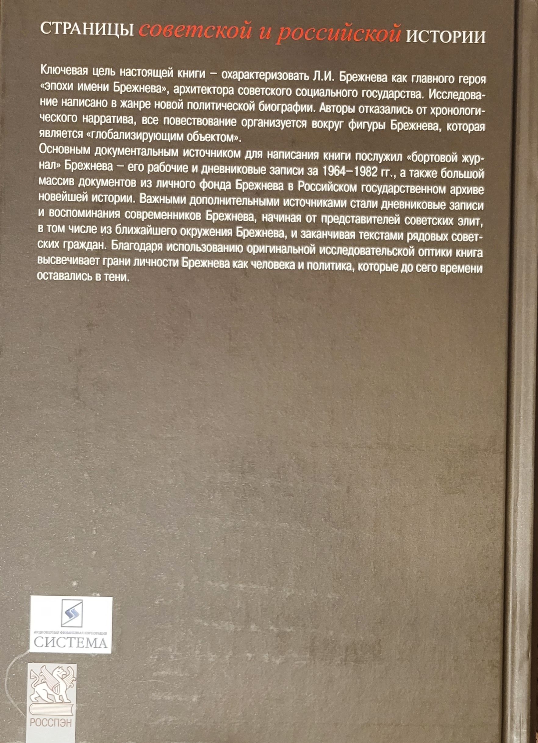 Ключевая цель настоящей книги – охарактеризовать Л.И. Брежнева как главного героя «эпохи имени Брежнева», архитектора советского социального государства. Исследование написано в жанре новой политической биографии. Авторы отказались от хронологического нарратива, все повествование организуется вокруг фигуры Брежнева, которая является «глобализирующим объектом». Основным документальным источником для написания книги послужил «бортовой журнал» Брежнева – его рабочие и дневниковые записи за 1964–1982 гг., а также большой массив документов из личного фонда Брежнева в Российском государственном архиве новейшей истории. Важными дополнительными источниками стали дневниковые записи и воспоминания современников Брежнева, начиная от представителей советских элит, в том числе из ближайшего окружения Брежнева, и заканчивая текстами рядовых советских граждан. Благодаря использованию оригинальной исследовательской оптики книга высвечивает грани личности Брежнева как человека и политика, которые до сего времени оставались в