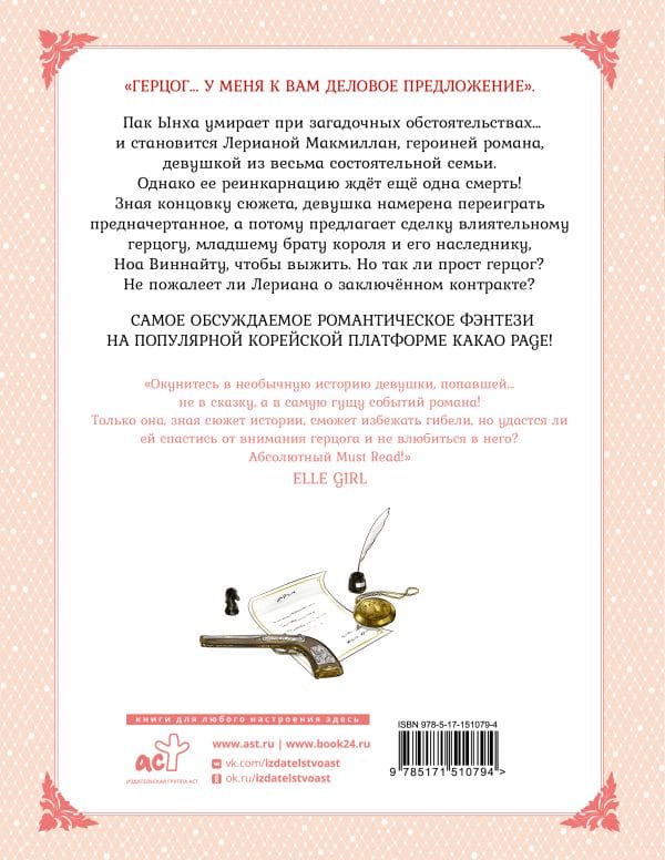 Пак Ынха умирает при загадочных обстоятельствах... и становится Лерианой Макмиллан, героиней романа, девушкой из весьма состоятельной семьи. Однако её реинкарнацию ждёт ещё одна смерть! Зная концовку сюжета, девушка намерена переиграть предначертанное, а потому предлагает сделку влиятельному герцогу, младшему брату короля и его наследнику, Ноа Виннайту, чтобы выжить. Но так ли прост герцог? Не пожалеет ли Лериана о заключённом контракте?