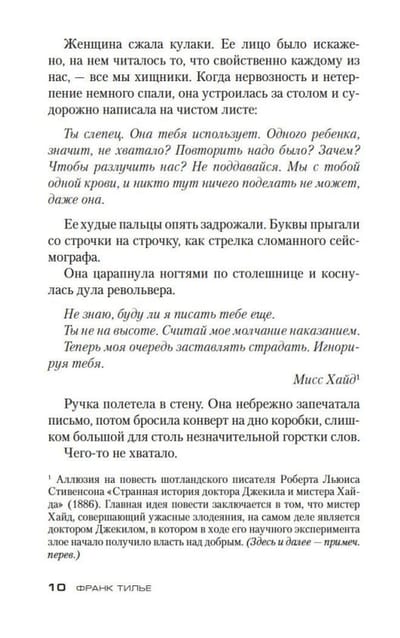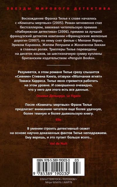 В романе Франка Тилье «Лес теней» (2007) престарелый миллиардер Артур Дофр решает с помощью начинающего писателя Давида Миллера осуществить давнишнюю мечту: воскресить на страницах книги серийного убийцу, известного под кличкой Палач-125 — по количеству граммов, которые преступник вырезал из плоти будущих жертв. В результате этой странной прихоти Давид с женой и маленькой дочкой, а также Дофр и его молодая любовница должны провести в немецком захолустье, сердце черного леса, целый месяц. Холод, снег, затерянное в лесной чаще шале. Писатель с азартом берется за историю об убийце-психопате, но вскоре всем становится ясно, что в шале творится что-то странное, а некоторые двери точно не стоило открывать…