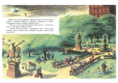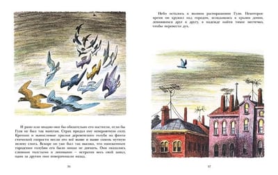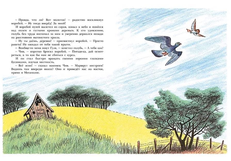 Деревенский голубь Гуля свободно парил в голубом небе, дышал чистым воздухом, ел вдоволь и не собирался ничего менять в своей жизни, пока буря не забросила к нему в сарай одного бойкого воробья. Чив, так звали нового знакомого, не понимал, как можно прозябать в деревне. Он так расхваливал прелести городской жизни, что Гуля решил отправиться с ним в Мегаполис. Только вот ничего хорошего из этого не получилось. В городе Гуля узнал, что за еду надо сражаться и лучший кусок всегда достается тому, кто сильнее. Его чуть не убил кран-разрушитель, и он едва не угодил на ужин коту. Домой его принесли на старой проволочной вешалке семеро воробышков. Они выходили больного голубя, да так и остались жить в его покосившемся амбаре, посреди полей и лугов, где никаких нет врагов, и еда сама в клюв прыгает. Эту сказку сочинил и нарисовал Билл Пит (1915-2002) – знаменитый американский художник, сценарист и писатель, книги которого вот уже более полувека издаются на разных языках мира.