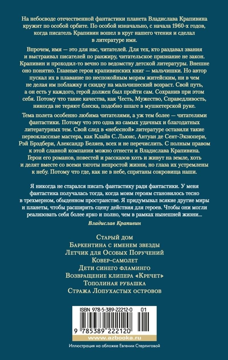 Свой след в «небесной» литературе оставили такие первоклассные мастера, как Клайв С. Льюис, Антуан де Сент-Экзюпери, Рэй Брэдбери, Александр Беляев, всех и не перечислить. С полным правом к этой славной компании можно отнести и Владислава Крапивина. Герои его романов, повестей и рассказов хоть и живут на земле, хоть и делят вместе со всеми тяготы непростой жизни, но глаза их устремлены к небу. Потому что где, как не в небе, спрятаны сокровища наши.