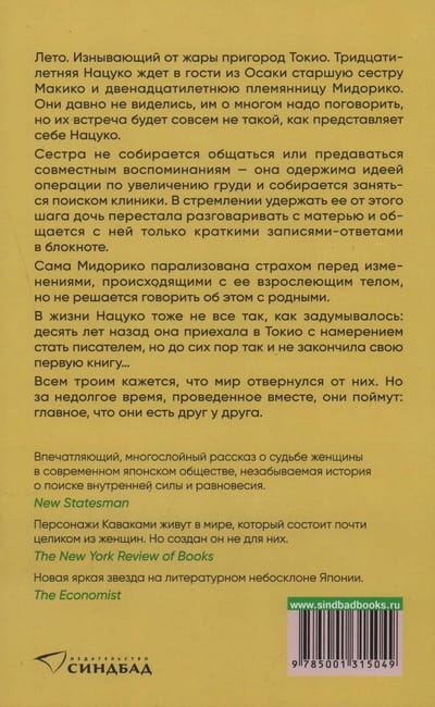 Сама Нацуко приехала в столицу десять лет назад. Она хотела стать писателем, но до сих пор так и не закончила книгу. Трем женщинам кажется, что мир отвернулся от них… Однако за несколько дней, проведенных вместе, они поймут главное: они есть друг у друга.