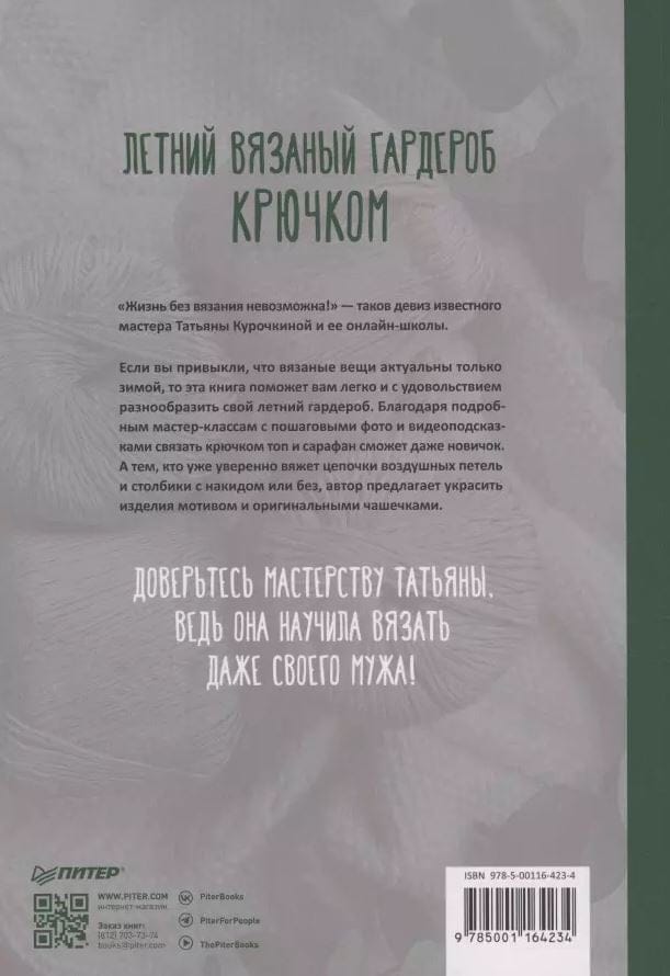 «Жизнь без вязания невозможна.» — таков девиз известного мастера Татьяны Курочкиной и ее онлайн-школы. Если вы привыкли, что вязаные вещи актуальны только зимой, то эта книга поможет вам легко и с удовольствием разнообразить свой летний гардероб. Благодаря подробным мастер-классам с пошаговыми фото и видео-подсказками связать крючком топ и сарафан сможет даже новичок. А тем, кто уже уверенно вяжет цепочки воздушных петель и столбики с накидом или без, автор предлагает украсить изделия мотивом и оригинальными чашечками.
