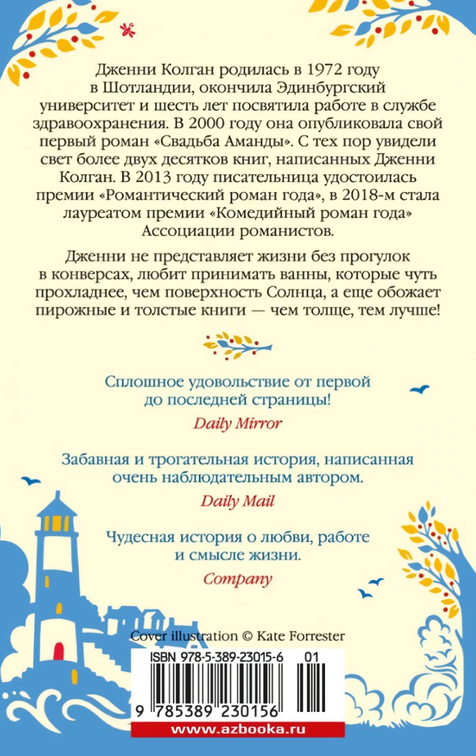 Как можно жить на краю, нет, за краем земли — на приливном островке, продуваемом всеми ветрами? Вдали от больших городов и привычных развлечений? Но такие робинзоны находятся — они приезжают сюда, навсегда влюбляются в Корнуолл и остаются, чтобы жить, работать и быть счастливыми. Одна из них — Полли Уотерфорд, быть может не избалованная везением, однако не зарывшая в землю свой талант: она умеет печь изумительно вкусный хлеб. У нее есть любимая работа, любимый человек и любимый домашний питомец (вообще-то, это морская птица), и все трое живут на маяке (другого жилья на острове не нашлось). Но как это часто бывает, идиллия не длится долго — в маленькой пекарне, где работает Полли, меняется владелец, и ей указывают на дверь. Ведь она совершенно не умеет экономить на качестве продуктов! Обитатели маяка переживают трудные времена и придумывают план спасения. Но чтобы его осуществить, придется расстаться — возможно, надолго. И вот, когда им наконец удается шаг за шагом приблизиться к цели, наступает очень славный, удачный, погожий день, не предвещающий ничего плохого... Плюс потрясающие рецепты от автора!