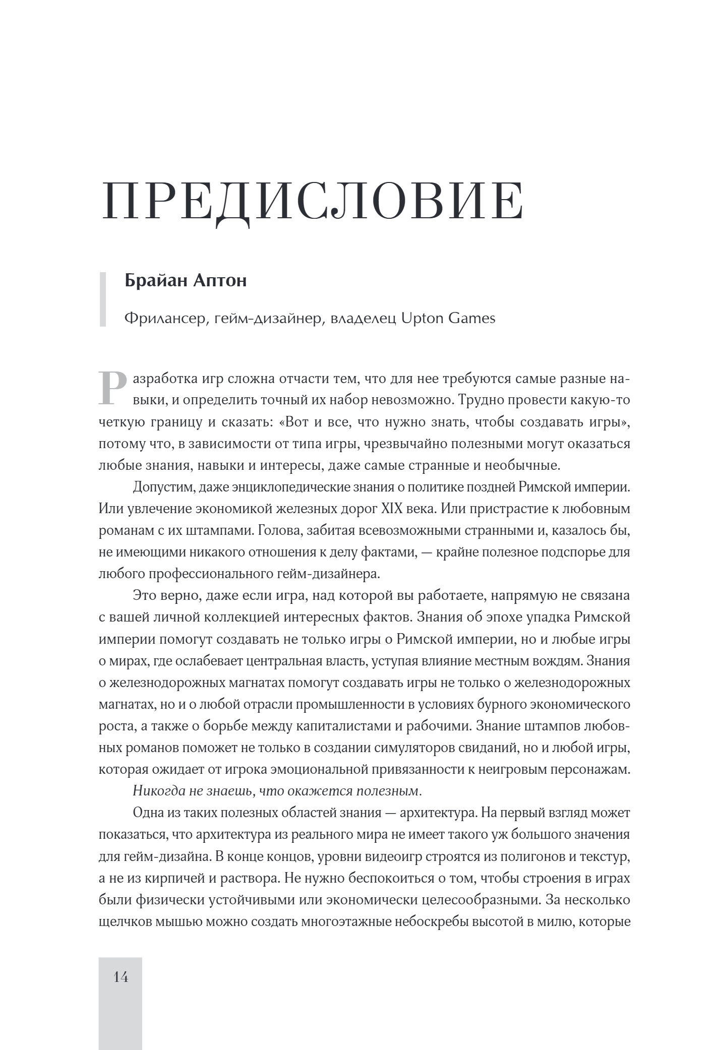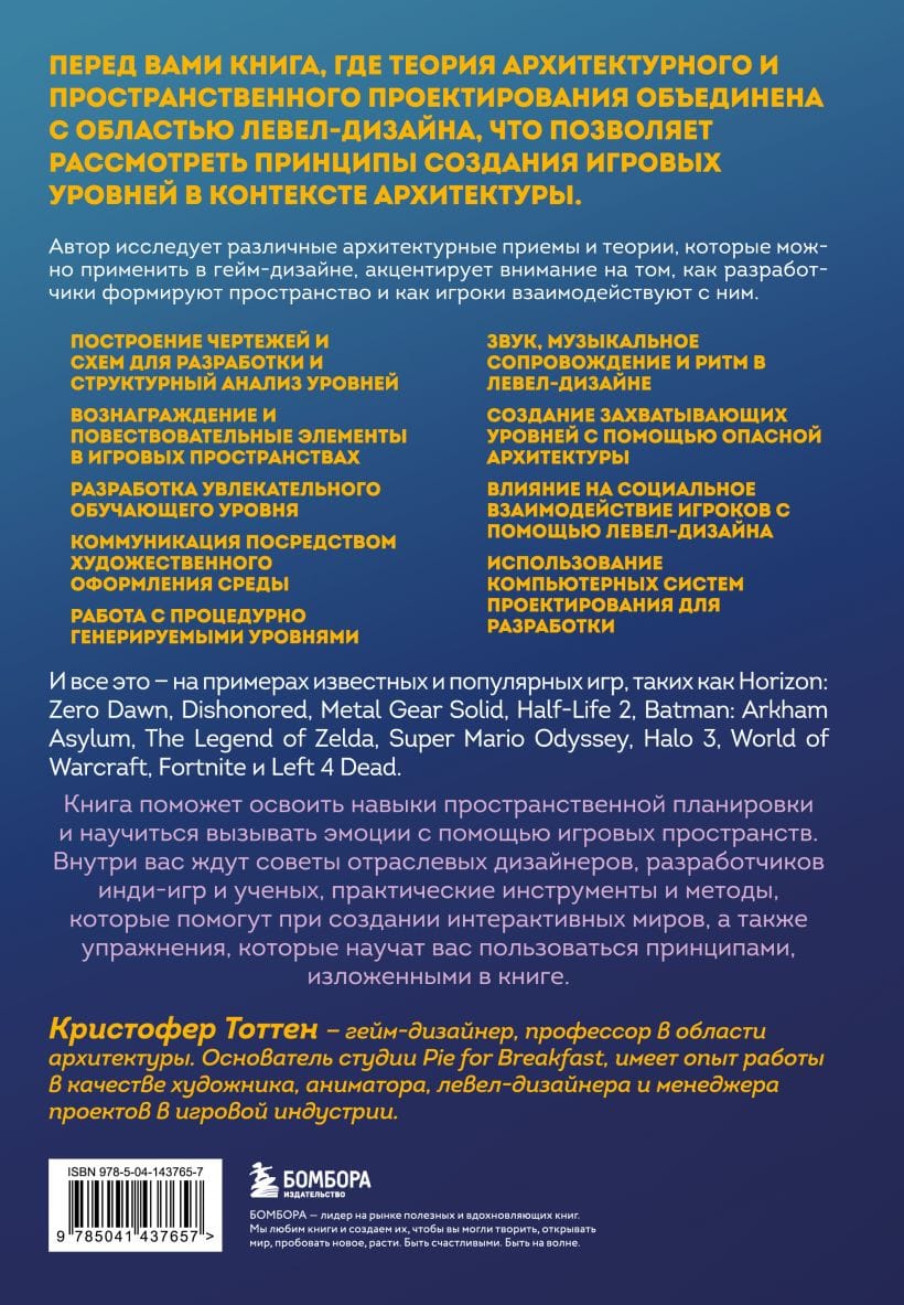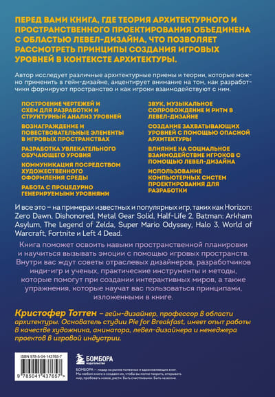 Перед вами книга, где теория архитектурного и пространственного проектирования объединена с областью левел-дизайна, что позволяет рассмотреть принципы создания игровых уровней в контексте архитектуры. Автор исследует различные архитектурные приемы и теории, которые можно применить в гейм-дизайне, акцентирует внимание на том, как разработчики формируют пространство и как игроки взаимодействуют с ним.