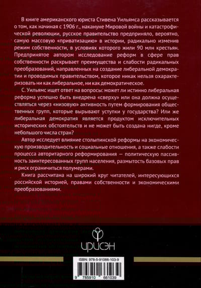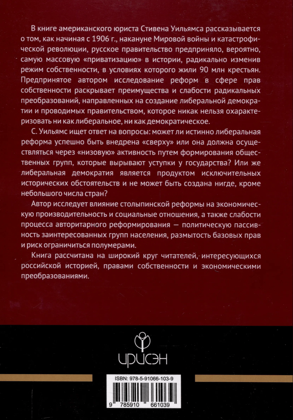 В книге американского юриста Стивена Уильямса рассказывается о том, как, начиная с 1906 г., накануне Мировой войны и катастрофической революции, русское правительство предприняло, вероятно, самую массовую «приватизацию» в истории, радикально изменив режим собственности, в условиях которого жили 90 млн крестьян. Предпринятое автором исследование реформ в сфере прав собственности раскрывает преимущества и слабости радикальных преобразований, направленных на создание либеральной демократии и проводимых правительством, которое никак нельзя охарактеризовать ни как либеральное, ни как демократическое.