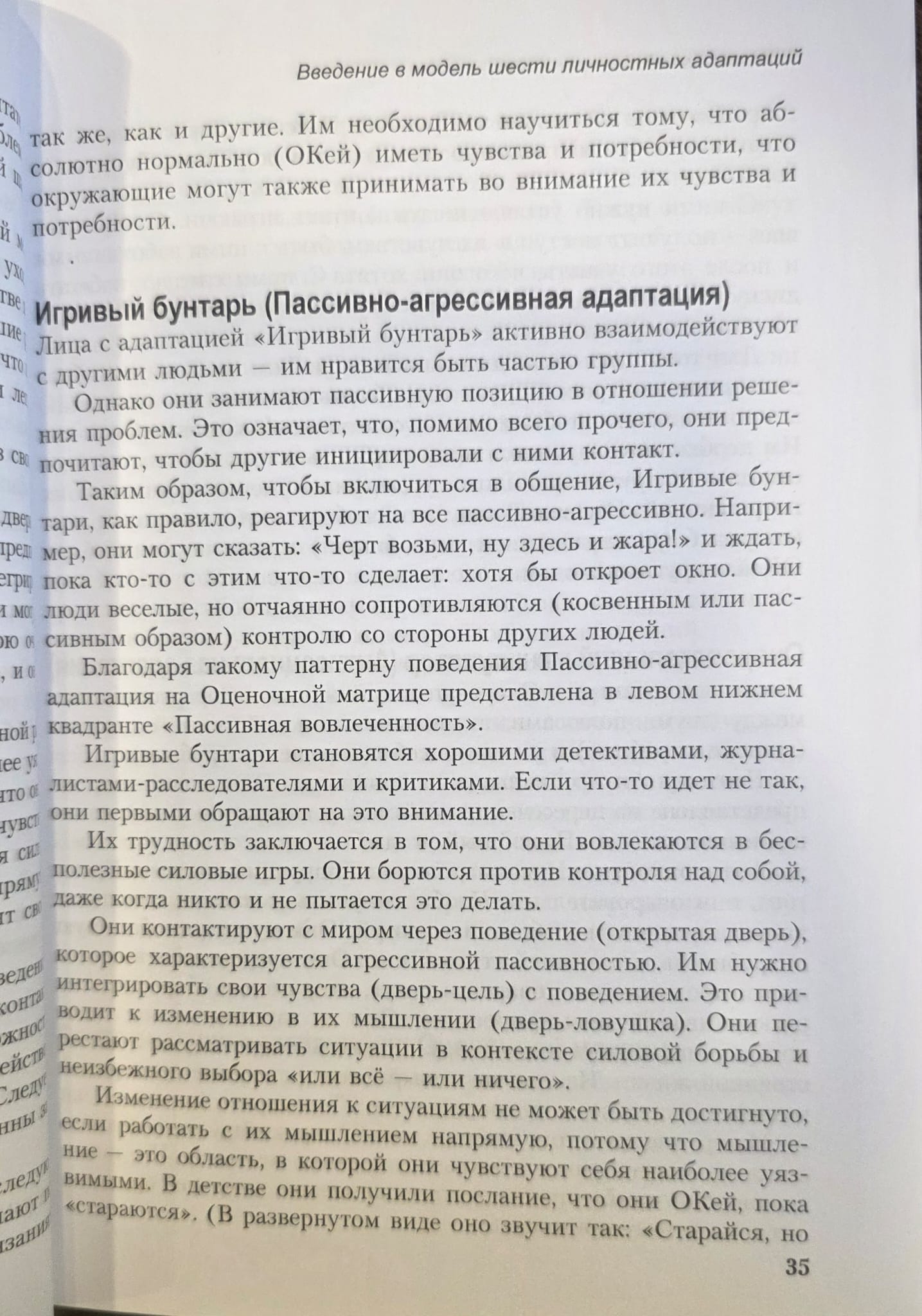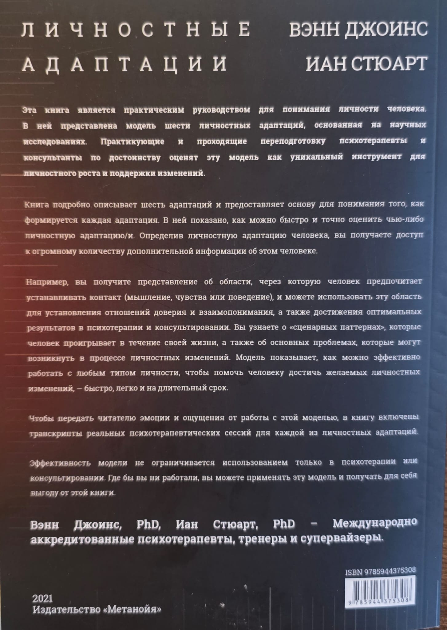 Эта книга является практическим руководством для понимания личности человека. В ней представлена модель шести личностных адаптаций, основанная на научных исследованиях. Практикующие психотерапевты и консультанты, а также находящиеся в процессе обучения специалисты по достоинству оценят эту модель как уникальный инструмент для личностного роста и поддержки изменений. Книга подробно описывает шесть адаптаций и предоставляет основу для понимания того, как формируется каждая адаптация. В ней показано, как можно быстро и точно оценить чью-либо личностную адаптацию/и. Определив личностную адаптацию человека, вы получаете доступ к огромному количеству дополнительной информации об этом человеке. Например, вы получите представление об области, через которую человек предпочитает устанавливать контакт (мышление, чувства или поведение), и можете использовать эту область для установления отношений доверия и взаимопонимания, а также достижения оптимальных результатов в психотерапии и консультировании. Вы узнаете о «жизненных паттернах» (сценарных паттернах), которые человек проигрывает в течение своей жизни, а также об основных проблемах, которые могут возникнуть в процессе личностных изменений. Модель показывает, как вы можете эффективно работать с каждым, чтобы помочь человеку достичь личностных изменений, — быстро, легко и на длительный срок. Чтобы передать читателю ощущения от работы с этой моделью, в книгу включены транскрипты реальных психотерапевтических сессий для каждой из личностных адаптаций. Эффективность модели не ограничивается использованием только в психотерапии или консультировании. Где бы вы ни работали, вы можете применять эту модель и получать для себя выгоду от этой книги.