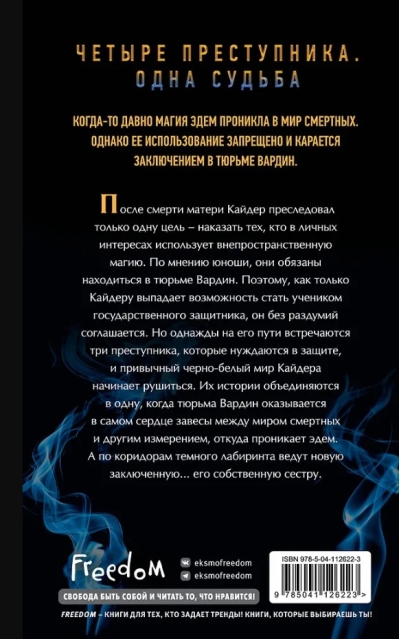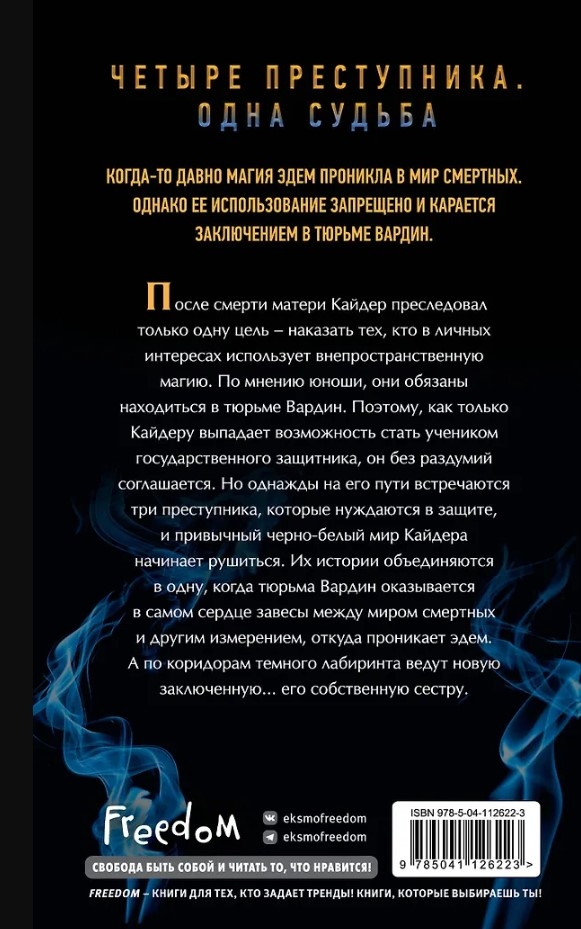 После смерти матери Кайдер преследовал только одну цель — наказать тех, кто в личных интересах использует внепространственную магию. По мнению юноши, они обязаны находиться в тюрьме Вардин. Поэтому, как только Кайдеру выпадает возможность стать учеником государственного защитника, он без раздумий соглашается. Но однажды на его пути встречаются три преступника, которые нуждаются в защите, и привычный черно-белый мир Кайдера начинает рушится. Их истории объединяются в одну, когда Вардин оказывается в самом сердце завесы между миром смертных и другим измерением, откуда проникает эдем. А по коридорам темного лабиринта ведут новую заключенную… его собственную сестру.