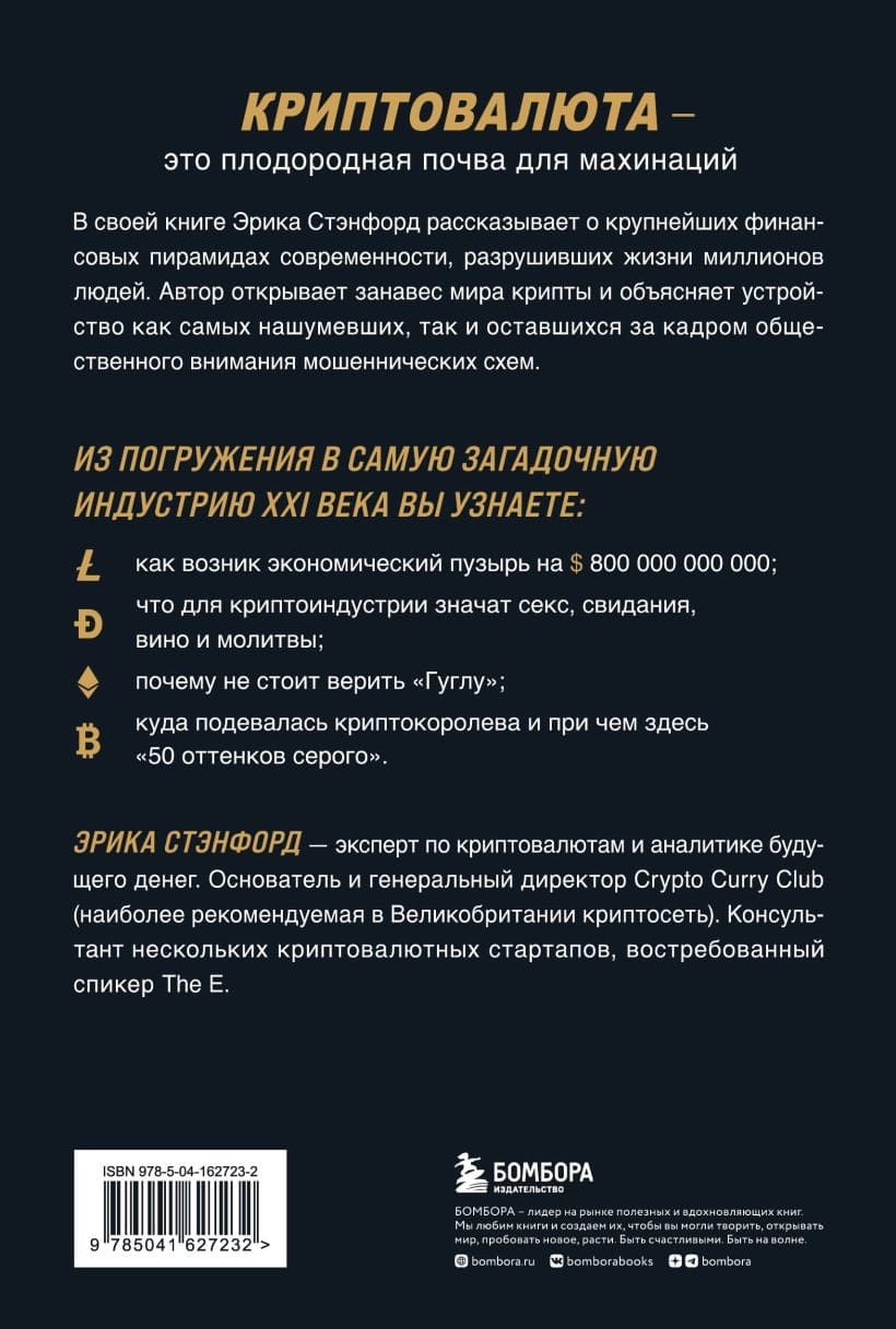 Криптовалюта — плодородная почва для махинаций. В своей книге Эрика Стэнфорд рассказывает о крупнейших финансовых пирамидах современности, разрушивших жизни миллионов людей. Автор открывает занавес мира крипты и объясняет устройство как самых нашумевших, так и оставшихся за кадром общественного внимания мошеннических схем.