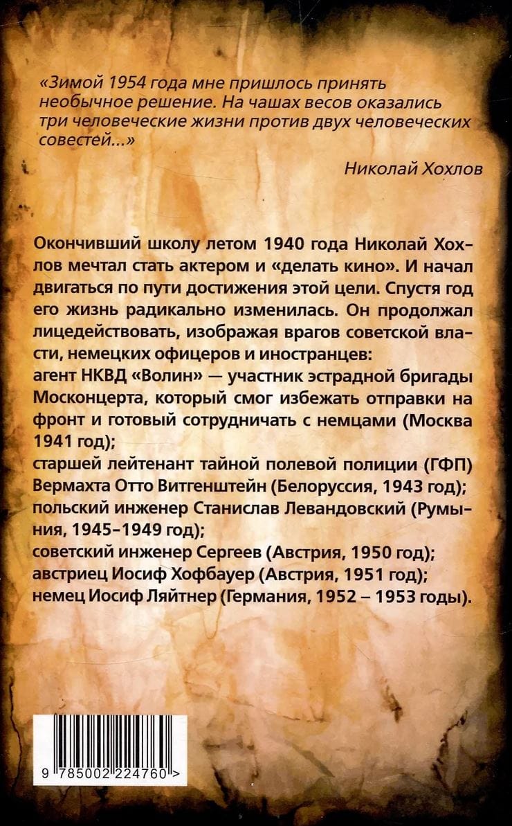 Окончивший школу летом 1940 года Николай Хохлов мечтал быть актером и «делать кино». И начал двигаться по пути достижения этой цели. Спустя год его жизнь радикально изменилась. Он продолжал лицедействовать, изображая врагов советской власти, немецких офицеров и иностранцев. Вот только малейшая ошибка могла стоить ему жизни. А режиссировал он не кинокартины или спектакли, а убийства врагов СССР, принимая активное участие в своих «постановках»… В сентябре 1941 года он был завербован сотрудниками 2-го отдела НКВД, возглавляемого Павлом Судоплатовым, и стал одним из ликвидаторов с Лубянки. А в 1954 году Николай Хохлов сбежал на Запад. В СССР заочно был приговорен к расстрелу. В 1957 году он был отравлен, предположительно с помощью радиоактивного изотопа – таллия или полония, но выжил после нескольких недель, проведённых в больнице. По мнению Хохлова, это была не единственная попытка отравления КГБ СССР. В своих мемуарах он подробно и откровенно рассказал о своей службе в НКВД-МГБ-КГБ и почему принял решение уйти со сцены театра «тайной войны», где он был «звездой».