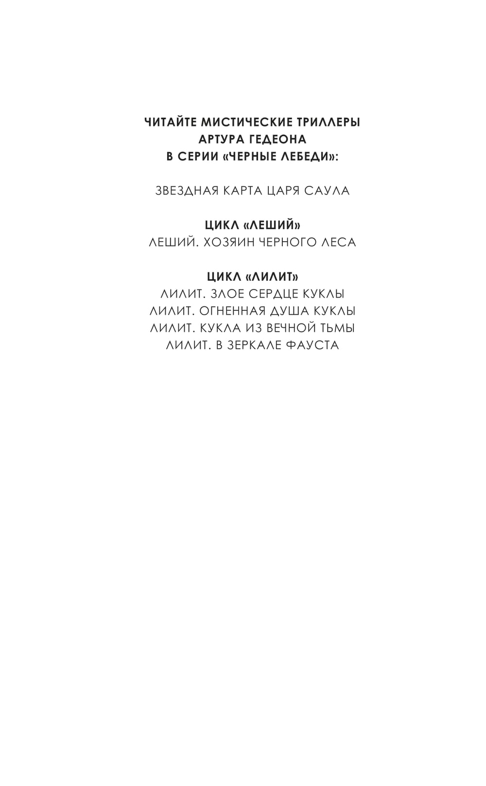 Новый роман Артура Гедеона «Лилит. В зеркале Фауста» повествует о демоне в женском обличье, который питается любовью мужчин и ненасытен в своем желании. Это Лилит, прекрасная и мстительная, способная изменять облик по своему желанию, странствовать по временам и эпохам, обращаться в кого угодно. Противостоять ей невозможно, встреча с ней может стать фатальной. Горе тому, кого она невзлюбит, но великая удача может улыбнуться дерзкому герою, который примет ее любовь. В наши дни история повторяется…