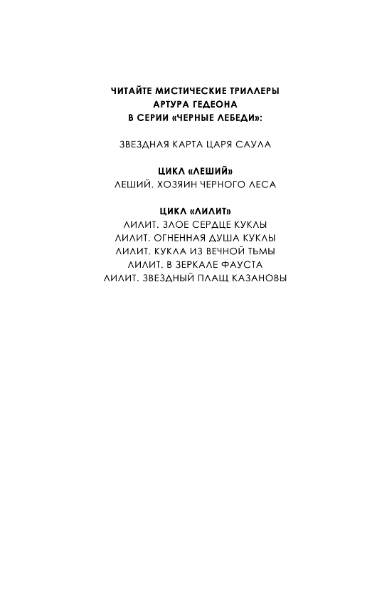 Романы Артура Гедеона из серии «Черные лебеди» — мистические триллеры с исторической подоплекой, где переплетаются реальность и потусторонний мир, оживают потаенные страхи, а городские легенды и старинные предания находят новое воплощение в наши дни.