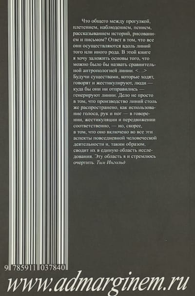 Что общего между прогулкой, плетением, наблюдением, пением, рассказыванием историй, рисованием и письмом? Ответ заключается в том, что все эти процессы протекают вдоль линий. В этой необычной книге британский антрополог Тим Ингольд представляет себе мир, в котором всё и вся состоит из переплетенных или взаимосвязанных линий, и закладывает основы новой дисциплины: сравнительной антропологии линии.