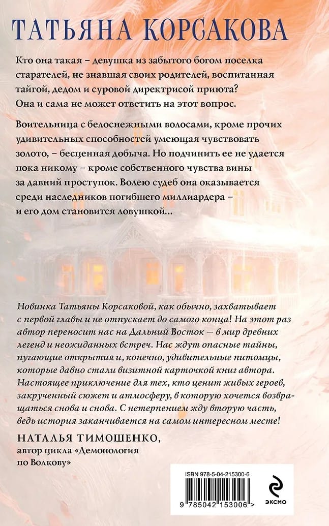 Кто она такая — девушка из забытого богом поселка старателей, не знавшая своих родителей, воспитанная тайгой, дедом и суровой директрисой приюта? Она и сама не может ответить на этот вопрос. Воительница с белоснежными волосами, кроме прочих удивительных способностей умеющая чувствовать золото, — бесценная добыча. Но подчинить ее не удается пока никому — кроме собственного чувства вины за давний проступок. Волею судеб она оказывается среди наследников погибшего миллиардера — и его дом становится ловушкой…