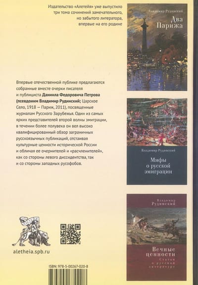 Впервые отечественной публике предлагаются собранные вместе очерки писателя и публициста Даниила Федоровича Петрова (псевдоним Владимир Рудинский ; Царское Село, 1918 — Париж, 2011), посвященные журналам Русского Зарубежья. Один из самых ярких представителей второй волны эмиграции, в течении более полувека он вел высококвалифицированный обзор заграничных русскоязычных публикаций, отстаивая культурные ценности исторической России и обличая ее очернителей и «расчленителей», как со стороны левого диссидентства, так и со стороны западных русофобов.