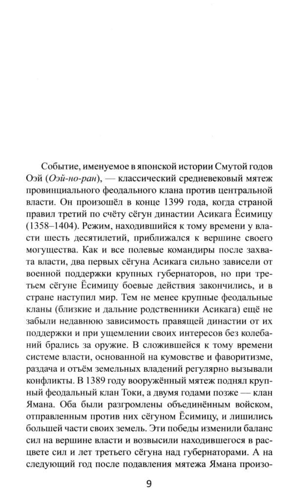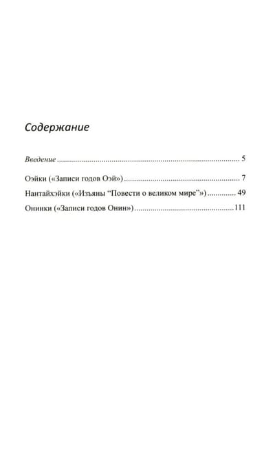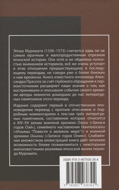 Эпоха Муромати (1336–1573) считается едва ли не самым мрачным и малопродуктивным отрезком японской истории. Она хотя и не обделена полностью вниманием историков, всё же очень уступает в этом отношении предшествующему и последующему периодам, не говоря уже о более близких к нам временах. Книга известного японоведа Александра Прасола за счёт глубокого обращения к первоисточникам расширяет наши знания о том, как воспринимали и описывали события своего времени авторы немногих дошедших до нас литературных памятников этого периода. Издание содержит первый в отечественном японоведении перевод с кратким описанием и подробным комментарием к текстам трёх литературных памятников, составление которых относится к XIV–XV векам: военной хроники Оэйки («Записи годов Оэй»), семейного наставления Нантайхэйки («Изъяны “Повести о великом мире”») и военной хроники Онинки («Записи годов Онин»). Снабжённая множеством иллюстраций книга даёт читателю возможность ближе познакомиться с некоторыми малоизвестными реалиями японской жизни периода Муромати.