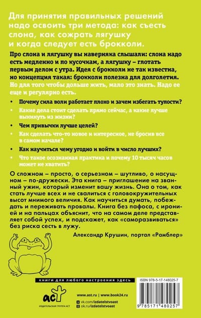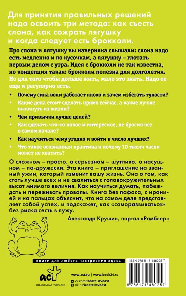 Для правильных решений надо освоить три метода: как съесть слона, как сожрать лягушку и когда следует есть брокколи. Про слона и лягушку вы наверняка слышали: слона надо есть медленно и по кусочкам, а лягушку — глотать первым делом, с утра. Идея с брокколи не так известна, но концепция такая: брокколи полезна для долголетия. Но для того чтобы дольше жить, мало это знать. Надо ее еще и регулярно есть. Почему сила воли работает плохо и зачем избегать тупости? Какие дела стоит сделать прямо сейчас, а какие лучше выкинуть из жизни? Чем привычки лучше целей? Как сделать что‑то новое и интересное, не бросив все в самом начале? Как научиться чему угодно и войти в число лучших? Что такое осознанная практика и почему 10 тысяч часов может не хватить? Алексей Марков, кандидат экономических наук, автор знаменитой «Хулиномики», рок‑звезда и отец четверых детей, учит людей думать в своей привычной манере: точно, жестко, с циничными шутками и очень легким языком.