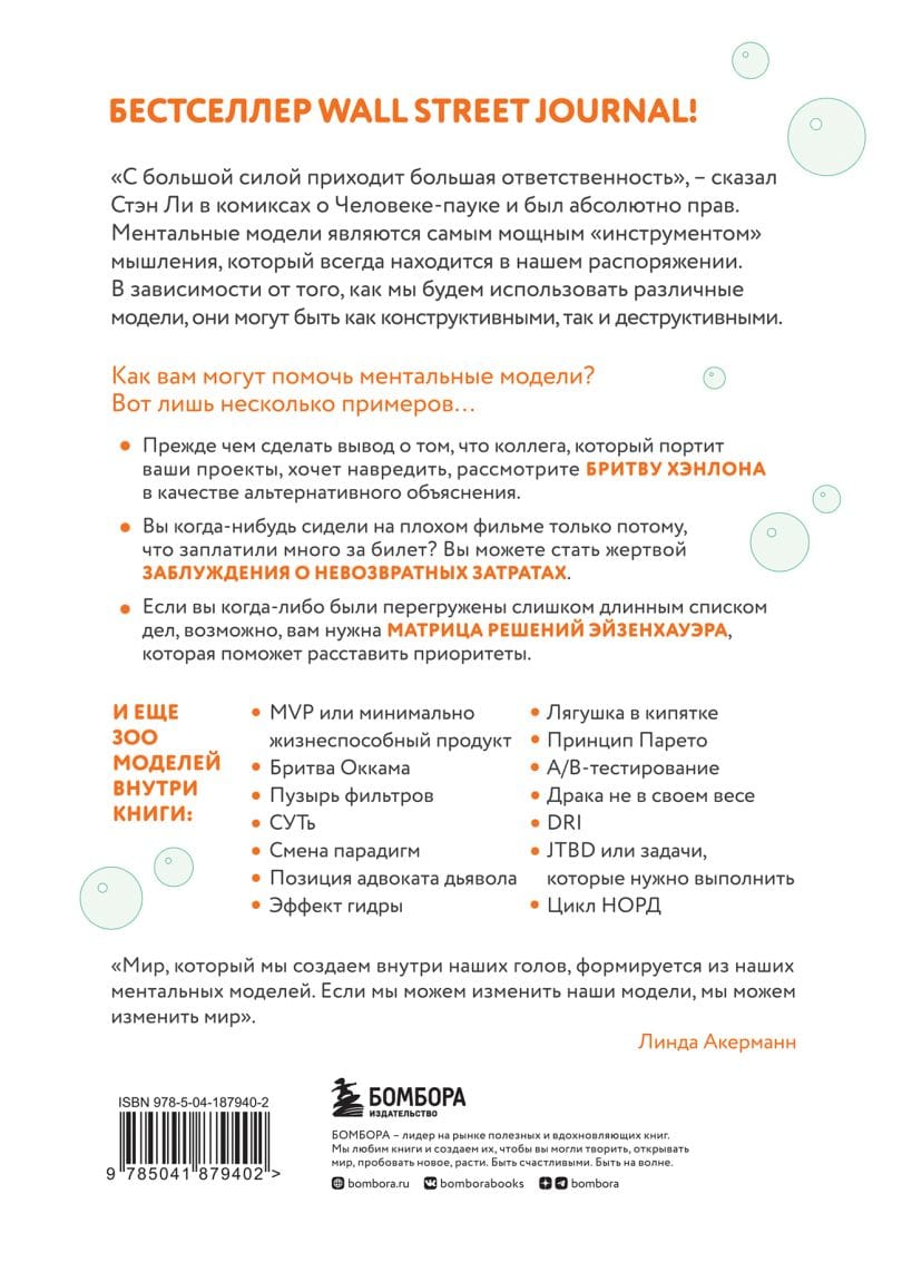Как вам могут помочь ментальные модели? Вот лишь несколько примеров… • Прежде чем сделать вывод о том, что ваш коллега, который портит ваши проекты, хочет навредить, рассмотрите «Бритву Хэнлона» в качестве альтернативного объяснения. • Вы когда-нибудь сидели на плохом фильме только потому, что заплатили много за билет? Вы можете стать жертвой заблуждения о невозвратных затратах. • Если вы когда-либо были перегружены слишком длинным списком дел, возможно, вам нужна Матрица решений Эйзенхауэра, которая поможет вам расставить приоритеты.