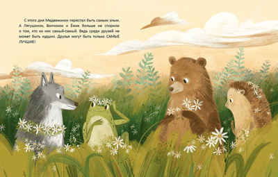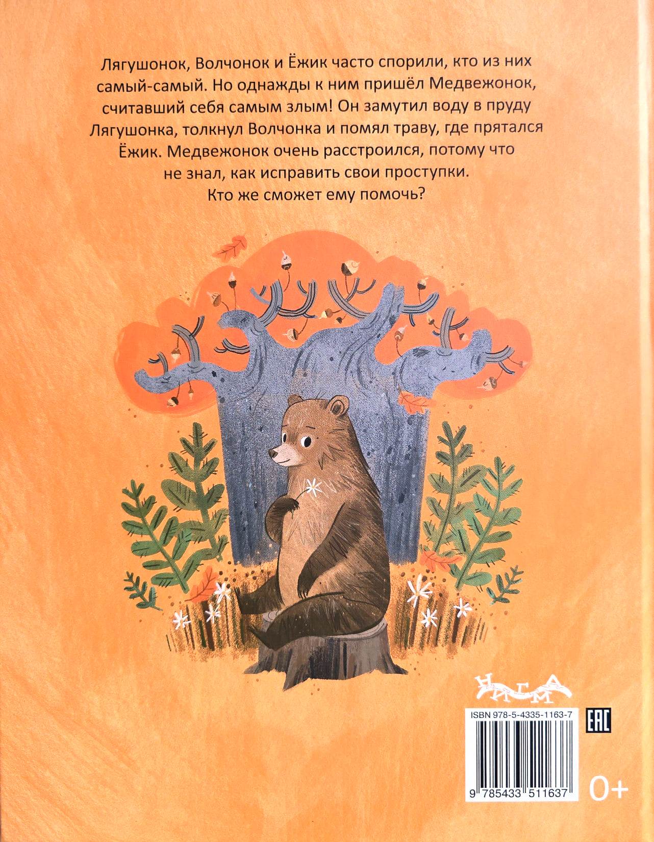 Лягушонок, Волчонок и Ёжик часто спорили, кто из них самый-самый. Но однажды к ним пришёл Медвежонок, считавший себя самым злым! Он замутил воду в пруду Лягушонка, толкнул Волчонка и помял траву, где прятался Ёжик. Медвежонок очень расстроился, потому что не знал, как исправить свои проступки. Кто же сможет ему помочь?