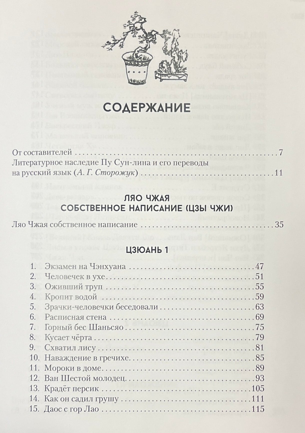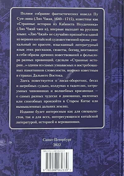 Полное собрание фантастических новелл Пу Сун-лина (Ляо Чжая, 1640—1715), известное как «Странные истории из кабинета неудачника» (Ляо Чжай чжи и). «Ляо Чжай» не случайно признаётся одной из вершин китайской художественной прозы: уникальный по красоте, изысканный литературный язык этих рассказов, сюжеты, богато впитавшие в себя образы древних повествований и фольклора разных провинций, сделали «Странные истории…» одним из самых узнаваемых и востребованных памятников словесности, широко известным в странах Дальнего Востока. Представленный в этом издании первый полный перевод «Странных историй…» выполнен академиком В. М. Алексеевым (1881—1951) и профессором А. Г. Сторожуком и снабжён обширными и разнообразными комментариями. Семь томов полностью повторяют структуру классического двенадцатицзюаневого свода «Ляо Чжая». Богатый иллюстративный материал взят из лучших литографов конца XIX века. В первый том вошли 1 и 2 цзюани (свитки) «Странных историй…» Издание будет интересным как для специалистов, так и для всех, интересующихся китайской литературой, историей и верованиями.