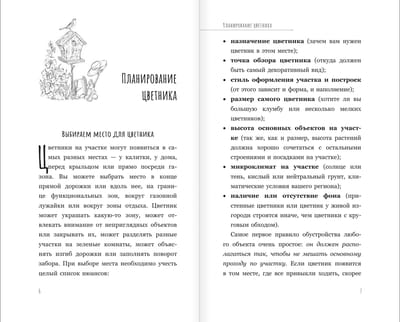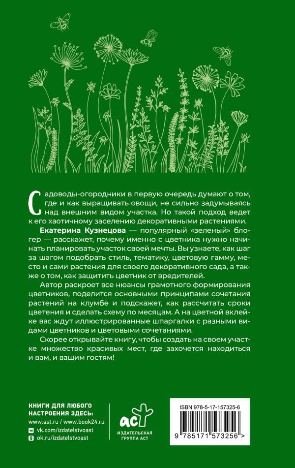 Екатерина Кузнецова — популярный «зеленый» блогер — расскажет, почему именно с цветника нужно начинать планировать участок своей мечты. Вы узнаете, как шаг за шагом подобрать стиль, тематику, цветовую гамму, место и сами растения для своего декоративного сада, а также о том, как защитить цветник от вредителей. Автор раскроет все нюансы грамотного формирования цветников, поделится основными принципами сочетания растений на клумбе и подскажет, как рассчитать сроки цветения и сделать схему по месяцам. А на цветной вклейке вас ждут иллюстрированные шпаргалки с разными видами цветников и цветовыми сочетаниями. Скорее открывайте книгу, чтобы создать на своем участке множество красивых мест, где захочется находиться и вам, и вашим гостям!