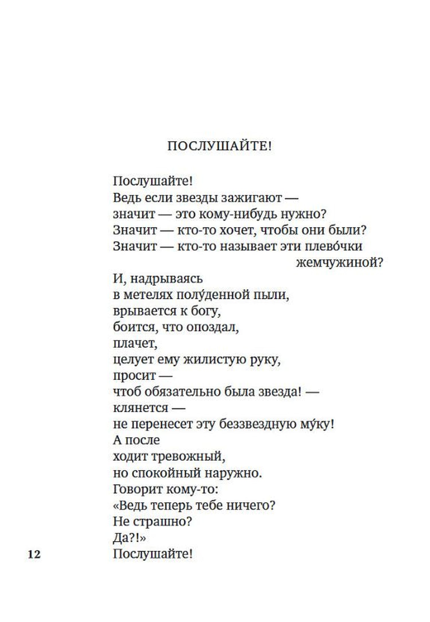 В настоящее издание вошли наиболее известные стихотворения и поэмы Владимира Маяковского — выдающегося поэта ХХ века, одного из лидеров русского авангарда. М. Цветаева называла его «первым в мире поэтом масс… первым русским поэтом-оратором». Маяковский, который «к штыку приравнял перо», стал подлинным голосом революции и символом советской эпохи. Но в истории литературы он остался не только в качестве «агитатора, горлана, главаря», своего рода летописца новой жизни. Как всякий большой поэт, Маяковский перерос свое время. О чем бы он ни писал: о любви к родине или о любви к женщине, прежде всего, он оставался поэтом-лириком, одним из самых пронзительных в русской литературе, творчество которого востребовано и новыми поколениями читателей.