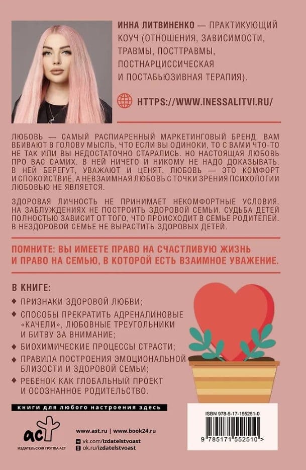 Автор развеивает клише и штампы, на которых строятся наши представления о любви. Она рассказывает о том, как на самом деле выглядят здоровые отношения и, главное, как их построить. Вы поймете, где допускали ошибки, и сможете создать счастливый союз, в котором не будет места боли, страхам и разрушенной самооценке, научитесь выстраивать диалог с партнером и родителями с позиции уважения, доверия и трезвой оценки. А еще эта книга незаменима для будущих мам и пап, которые хотят воспитать ребёнка самостоятельной и свободной личностью.