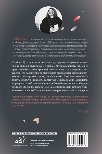 Одинокий упаковщик смыслов в буквы, обитающий на самом краю. Работает под прикрытием «жена/мать семейства/писатель/колумнист/инфлюэнсер». «Любовь. До и после» — честная и до предела откровенная книга о женщинах, мужчинах и о любви. Автор со свойственными ей прямолинейностью и иронией рассказывает о зарождении этого чувства, его развитии и последующем перерождении в таких разных «по смыслу» созданиях, как «М» и «Ж». Помогает женщинам понять мужскую природу, расстаться с любовными иллюзиями и превратить любовь-сомнение в любовь-безмятежность. Отдельная глава книги посвящена изменам, многочисленным заблуждениям о них и способам исцеления «поврежденных» мозга и души. «Господи, помоги нам всем, иначе мы измучаем себя и другого и жизнь потратим на это, так и не пожив в радости».