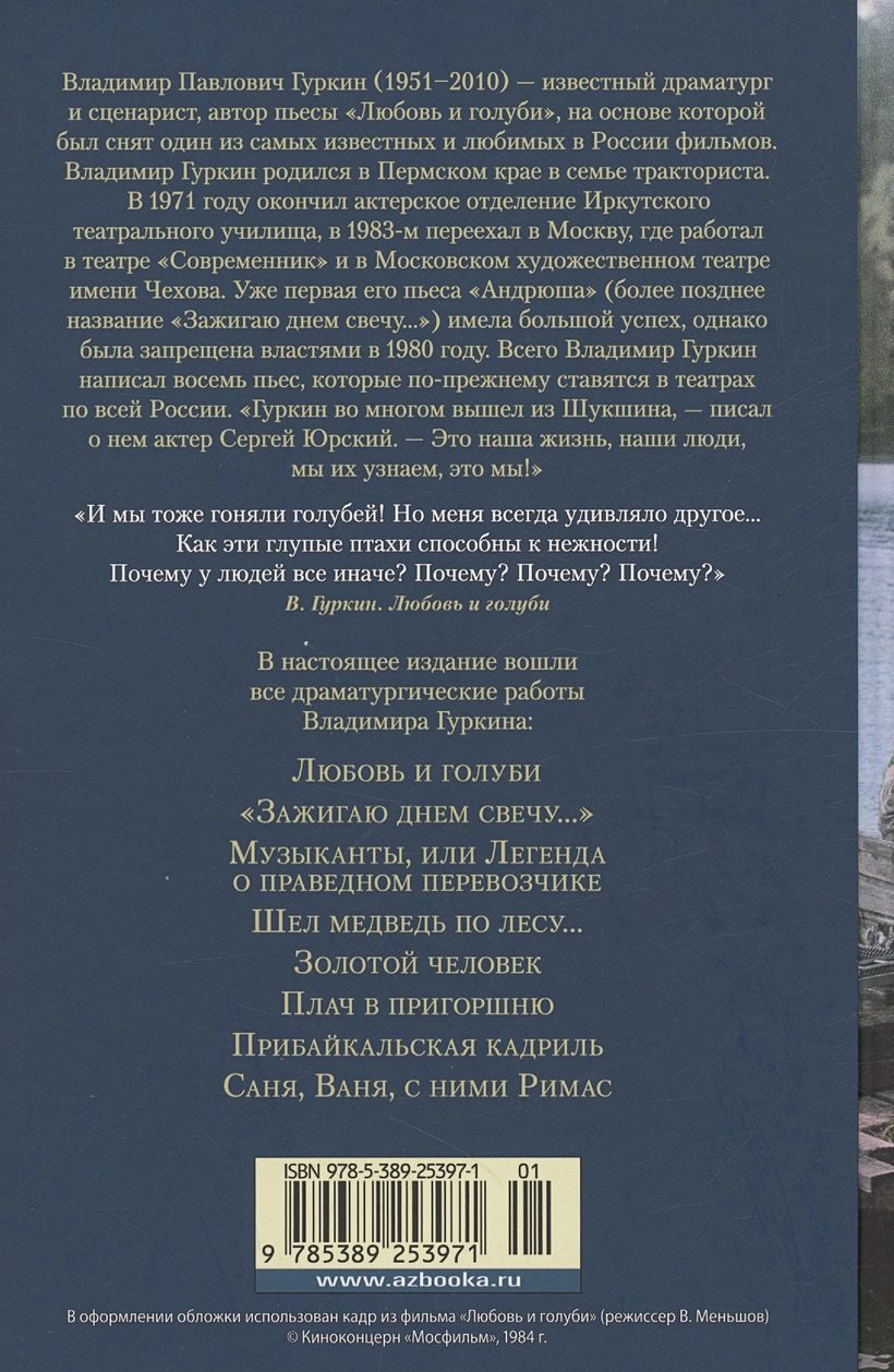 Владимир Павлович Гуркин (1951–2010) — известный драматург и сценарист, автор пьесы «Любовь и голуби», на основе которой был снят один из самых известных и любимых в России фильмов. Владимир Гуркин родился в Пермском крае в семье тракториста. В 1971 году окончил актерское отделение Иркутского театрального училища, в 1983-м переехал в Москву, где работал в театре «Современник» и в Московском художественном театре имени Чехова. Уже первая его пьеса «Андрюша» (более позднее название «Зажигаю днем свечу…») имела большой успех, однако была запрещена властями в 1980 году. Всего Владимир Гуркин написал восемь пьес, которые по-прежнему ставятся в театрах по всей России. «Гуркин во многом вышел из Шукшина, — писал о нем актер Сергей Юрский. — Это наша жизнь, наши люди, мы их узнаем, это мы!» В настоящий сборник вошли все восемь пьес Владимира Гуркина: «Любовь и голуби», «Плач в пригоршню», «Прибайкальская кадриль», «Золотой человек» и другие.