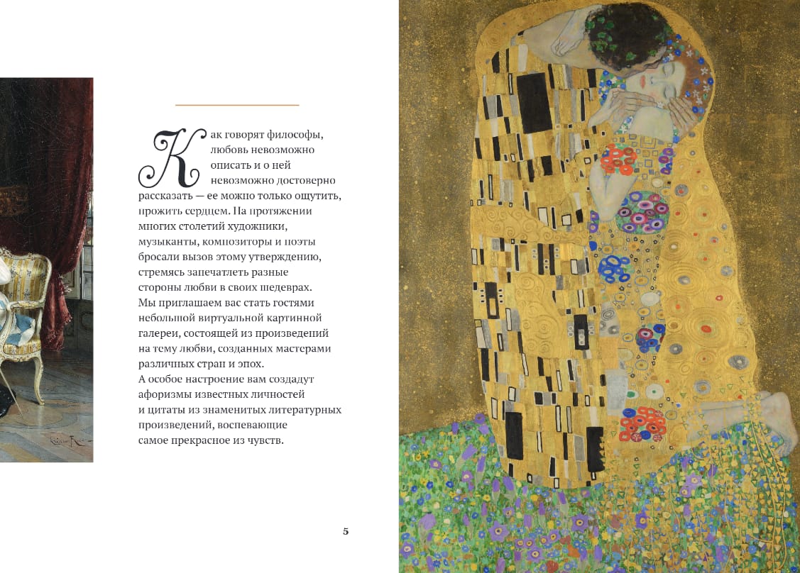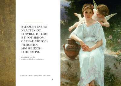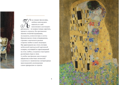 На его страницах — первые признания и встречи, поцелуи и объятия, обещания верности и горечь разлуки, воплощенные в произведениях великих художников: Сандро Боттичелли, Жан-Оноре Фрагонара, Эдмунда Лейтона, Джона Уотерхауса, Огюста Ренуара, Густава Климта и других.