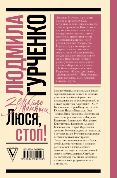 Людмила Гурченко (1935–2011) — народная артистка СССР, эстрадная певица, была и остается любима зрителями. Кто-то до сих пор хорошо помнит спектакли и концерты с ее участием, кто-то еще только знакомится с этой удивительной актрисой по ее ролям в фильмах. Творчество Гурченко будет восхищать и потрясать вечно: она смогла создать такие образы, которые, увидев раз, запоминаешь на всю жизнь. Невозможно остаться равнодушным, посмотрев кинокартины «Карнавальная ночь», «Любимая женщина механика Гаврилова», «Вокзал для двоих», «Любовь и голуби», «Моя морячка», «Аплодисменты, аплодисменты» и многие другие. Зажигательная, эмоциональная, яркая, харизматичная, ни на кого не похожая, разная в каждой своей роли, она навсегда пленяла не только зрителей, но и своих партнеров. А среди них — Олег Басилашвили, Юрий Никулин, Сергей Юрский, Никита Михалков, Олег Табаков, Нина Дорошина… Конечно, ей повезло и с режиссерами — Эльдаром Рязановым, Владимиром Меньшовым, Константином Воиновым, Андреем Кончаловским, Кирой Муратовой и другими. Все они предлагали такие роли, в которых талант Гурченко раскрывался необыкновенно и многогранно. Также раскрылся он и в книге «Люся, стоп!», где она увлеченно и с юмором рассказывает о жизни, съемках, знаменитых людях и, конечно, о своей семье и любимых внуках. Она была по-настоящему счастливой женщиной и этим счастьем щедро поделилась с читателем.