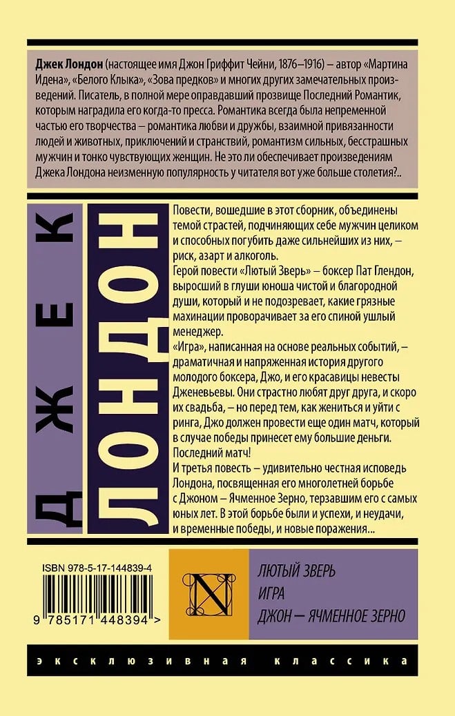Повести, вошедшие в этот сборник, объединены темой страстей, подчиняющих себе мужчин целиком и способных погубить даже сильнейших из них – риск, азарт и алкоголь. Герой повести «Лютый Зверь» – боксер Пат Глендон, выросший в глуши юноша чистой и благородной души, который и не подозревает, какие грязные махинации проворачивает за его спиной ушлый менеджер. «Игра», написанная на основе реальных событий, – драматичная и напряженная история другого молодого боксера Джо и его красавицы невесты Дженевьевы. Они страстно любят друг друга, и скоро их свадьба, – но перед тем, как жениться и уйти с ринга, Джо должен провести еще один матч, который, в случае победы, принесет ему большие деньги. Последний матч! И третья повесть – удивительно честная исповедь Лондона, посвященная его многолетней борьбе с Джоном – Ячменное Зерно, терзавшим его с самых юных лет. В этой борьбе были и успехи, и неудачи, и временные победы, и новые поражения...