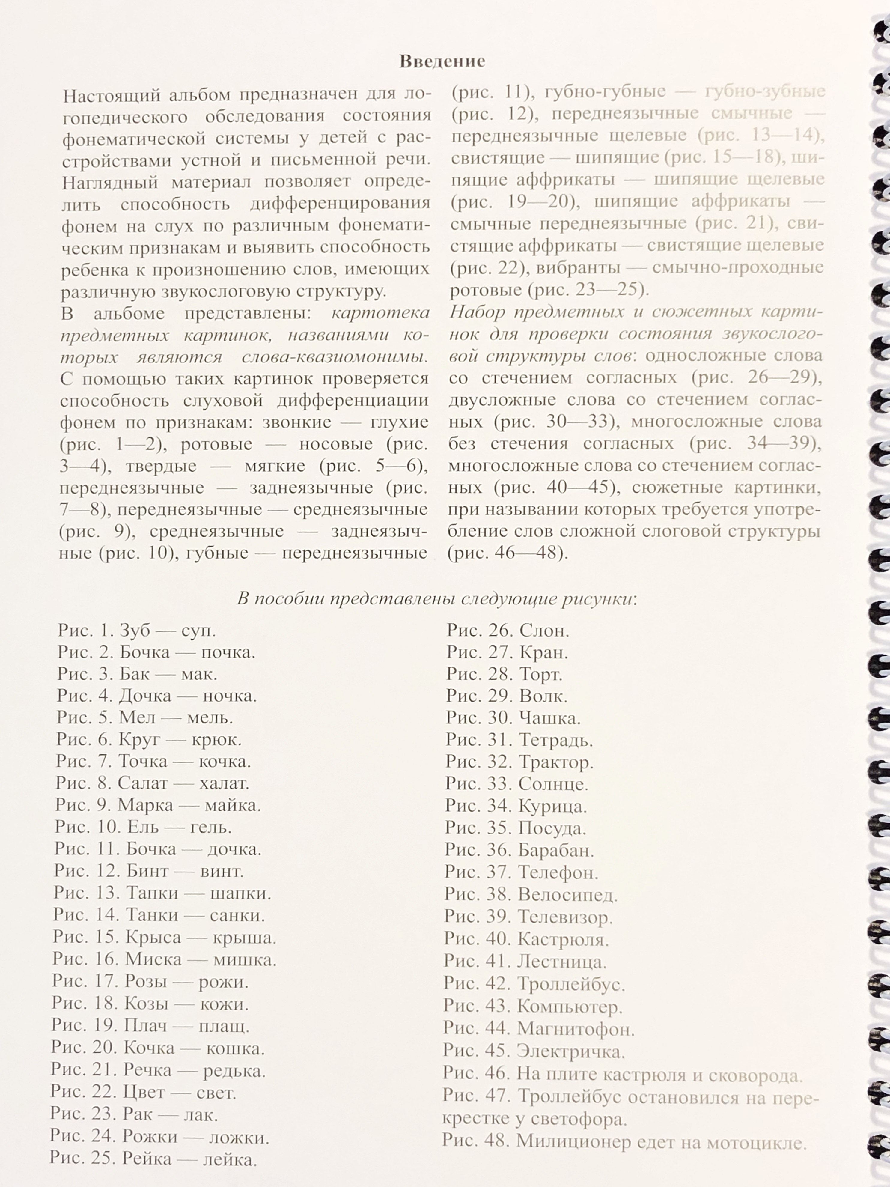 Альбом предназначен для логопедического обследования состояния фонематической системы у лиц с расстройством устной и письменной речи. Содержит наглядный материал для диагностической работы логопедов.