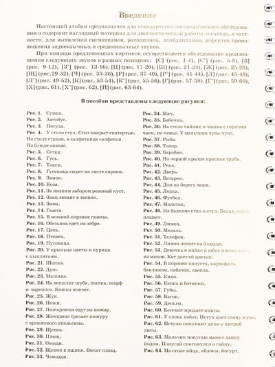 Альбом предназначен для стандартного логопедического обследования. Он состоит из 64 цветных предметных и сюжетных картинок для диагностической работы логопеда. Представленный материал необходим при обследовании лиц с нарушениями звукопроизношения. Рисунки подобраны таким образом, чтобы можно было определить состояние произношения звука в разных позициях в слове, а также в словах простой и сложной звукослоговой структуры. Для логопедов.
