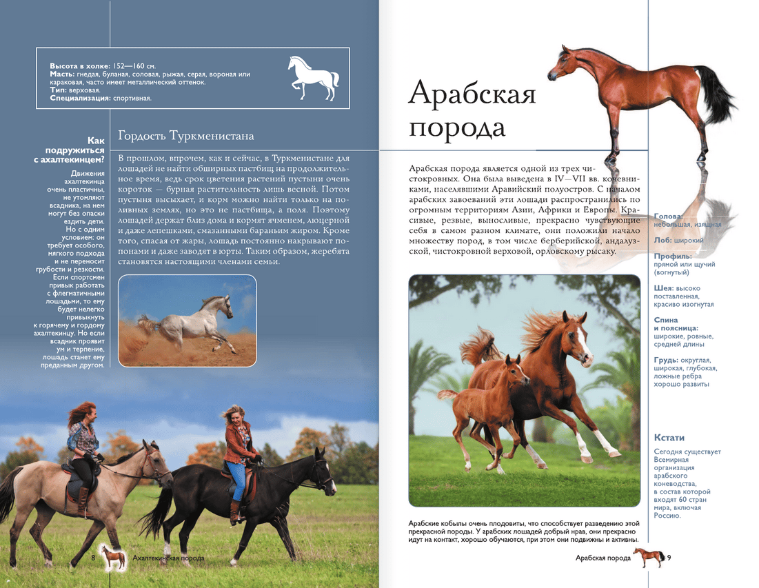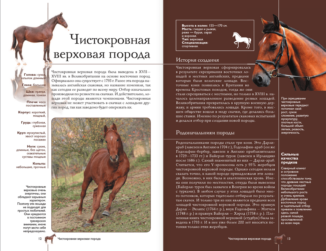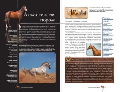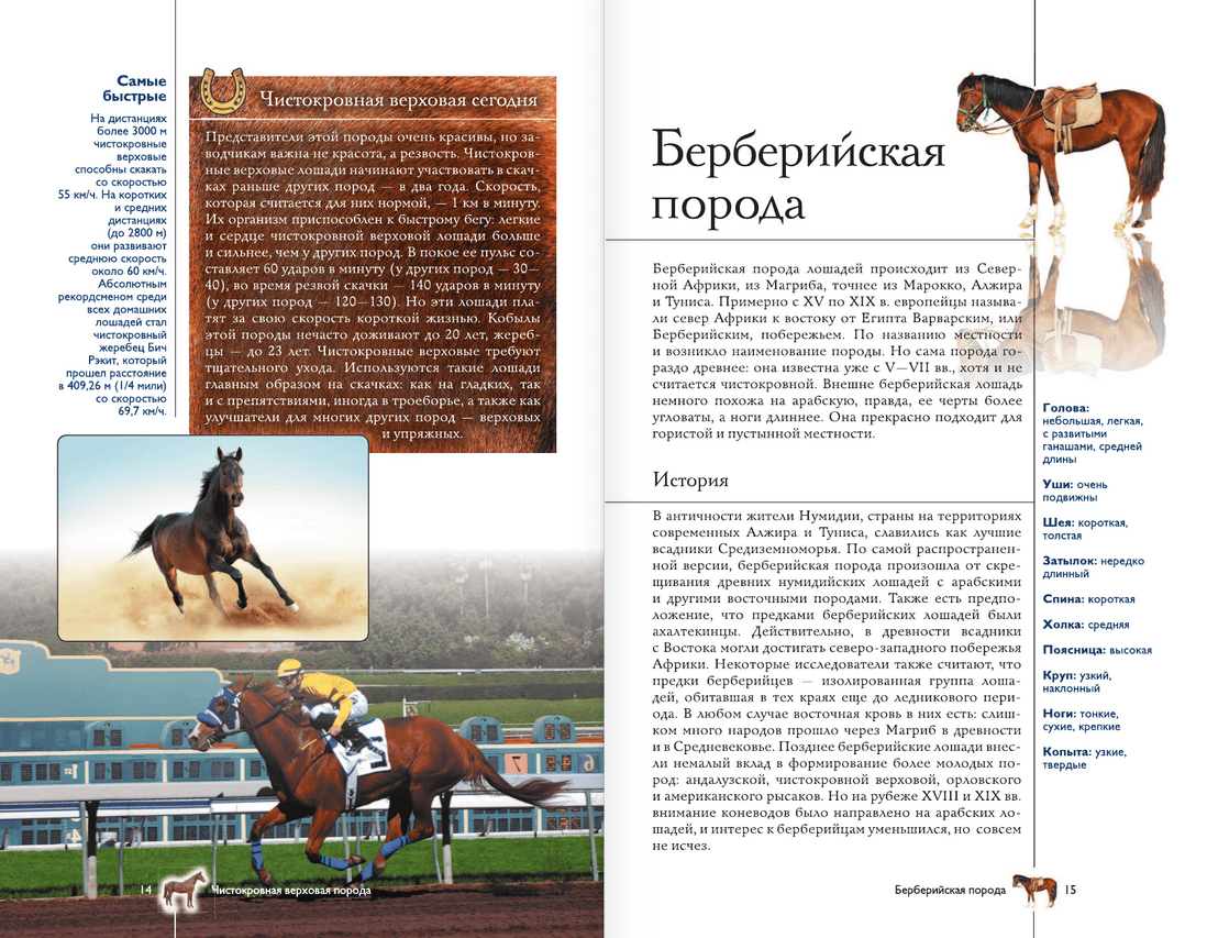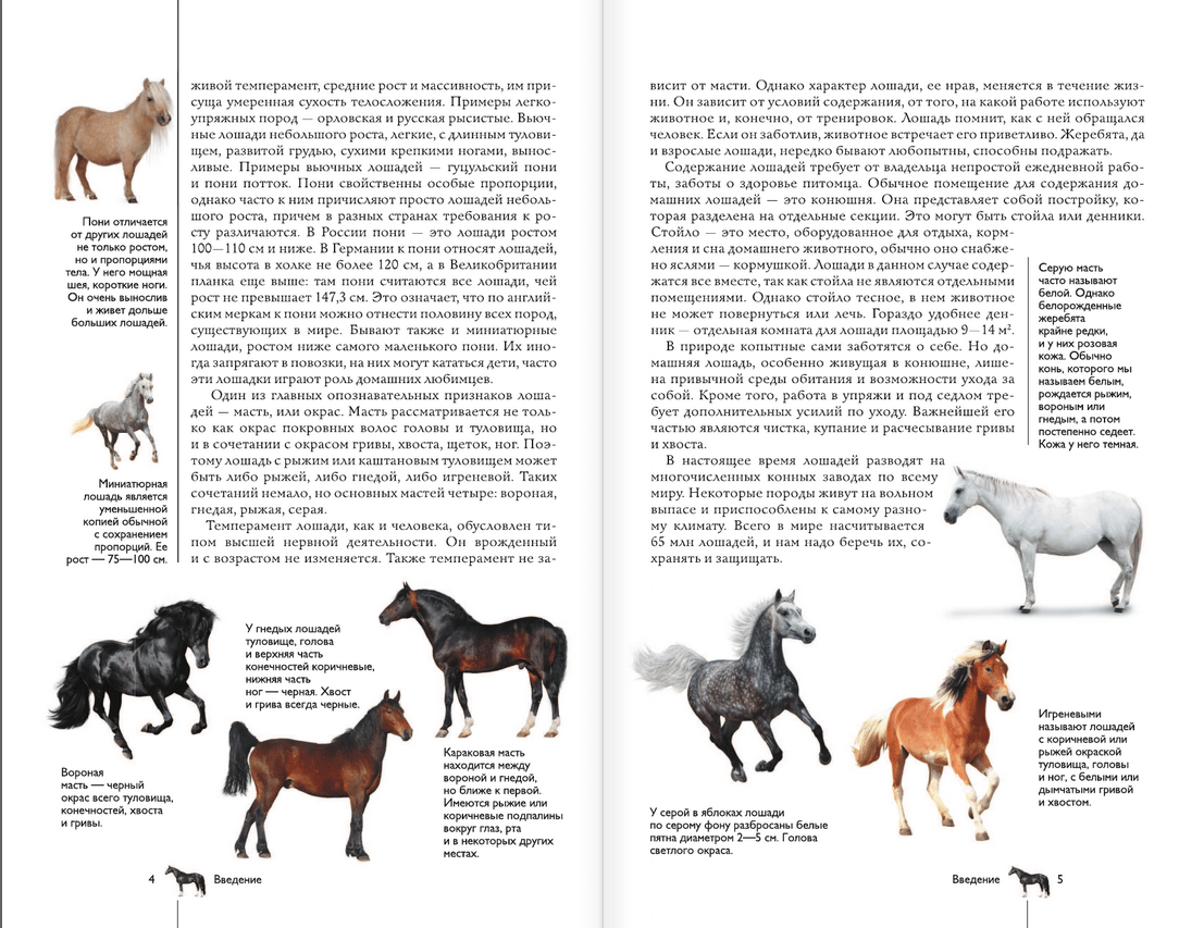 Как известно, люди приручили лошадей еще в доисторические времена, а сегодня почти не встретишь человека, который бы не восхищался этими благородными животными. Но как узнать, что скрывается за взглядом их влажных глаз и гордой статью?Кто из них станет призовым скакуном, а кто подойдет начинающему наезднику? Почему порой два похожих жеребца так сильно отличаются по достижениям? Эти и другие тайны мира лошадей шаг за шагом откроет для вас популярный иллюстрированный гид. Информация, дополненная сравнительными таблицами и яркими иллюстрациями, даст возможность легко ориентироваться в мире конюшен и скачек, а сведения о происхождении, условиях разведения лошадей, традициях их воспитания и тренировок помогут по достоинству оценить этих прекрасных животных. Путешествие в мир лошадей вместе с этим красочным изданием может стать первым шагом на пути к увлечению, которое навсегда останется с вами.