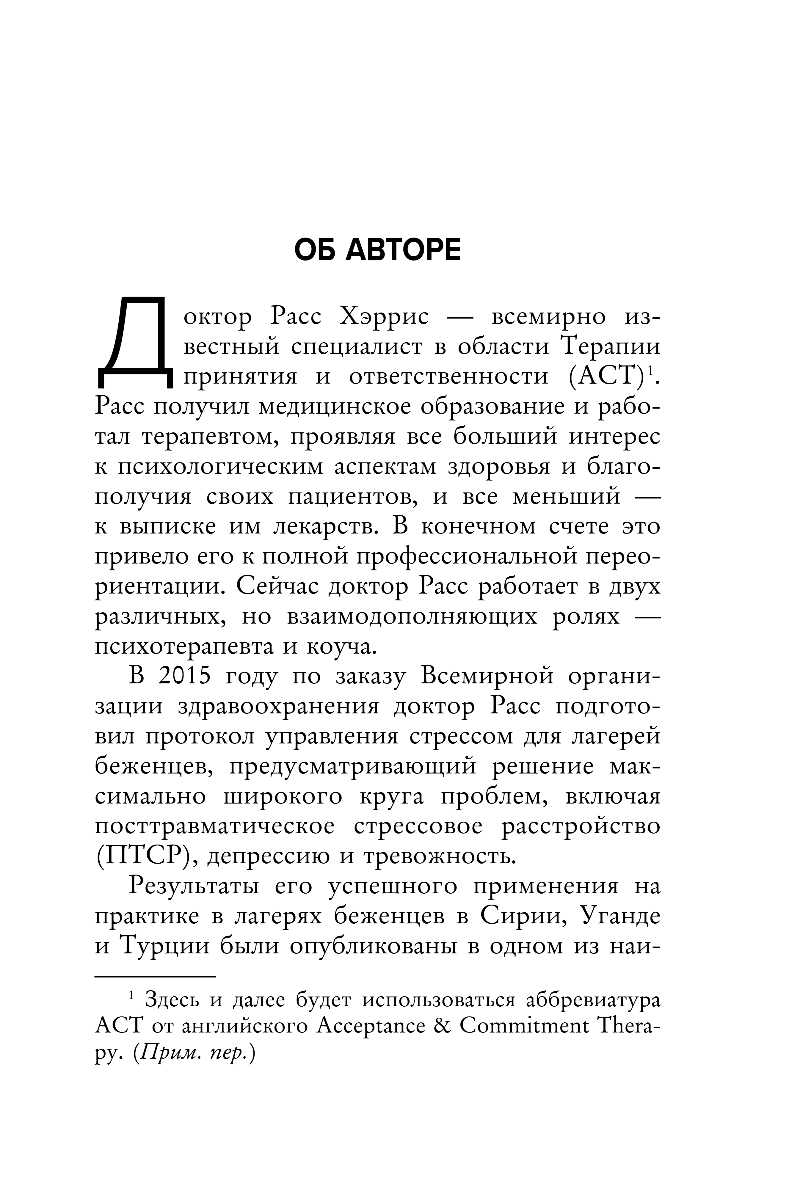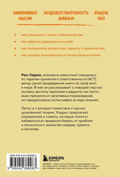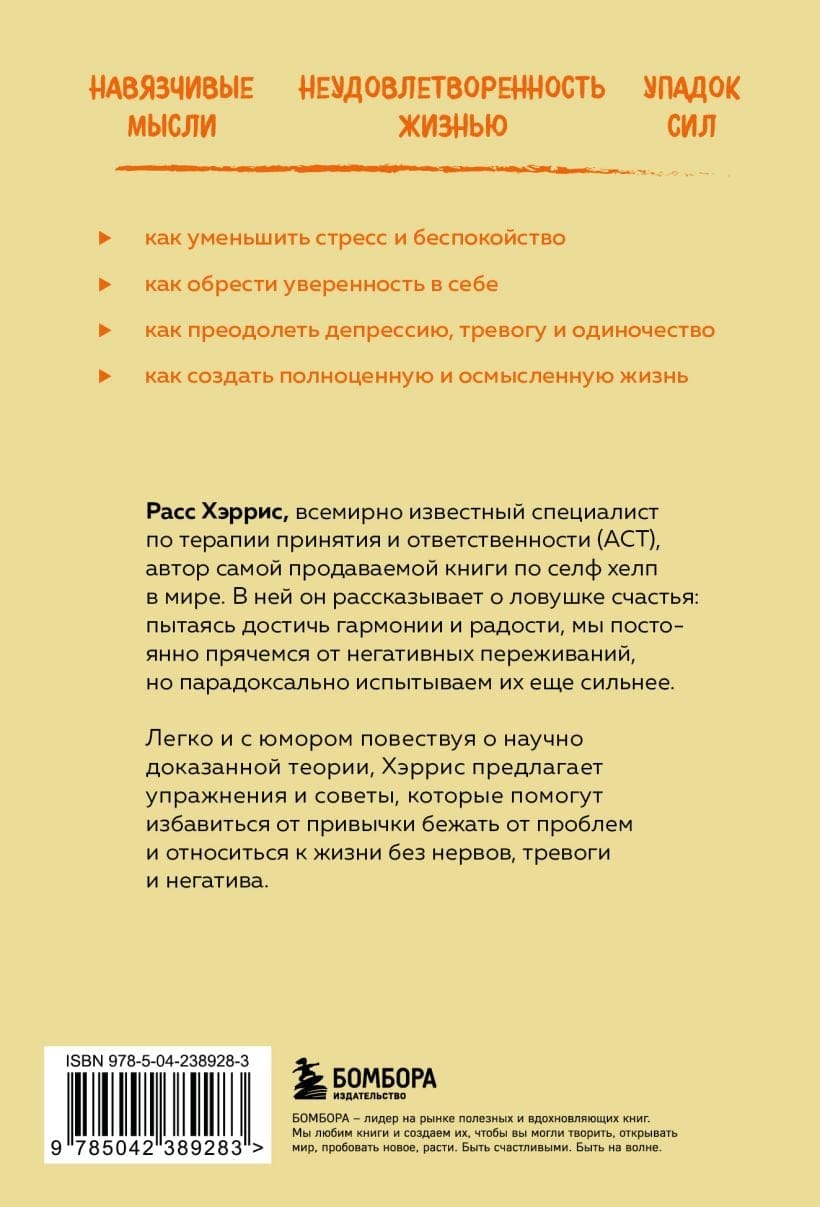 Расс Хэррис, всемирно известный специалист по терапии принятия и ответственности (АСТ), автор самой продаваемой книги по селф хелп в мире. В ней он рассказывает о ловушке счастья: чем активнее мы стремимся к счастью, тем больше мы подвержены депрессии и тоске. Легко и с юмором рассказывая о возможностях терапии принятия и ответственности (АСТ), Хэррис предлагает упражнения и советы, которые помогут избавиться от привычки бежать от проблем и относиться к жизни без нервов, тревоги и негатива.