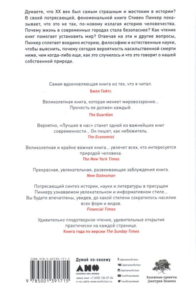 В этой революционной работе Пинкер исследует глубины человеческой природы и, сочетая историю с психологией, рисует удивительную картину мира, который все чаще отказывается от насилия. Автор помогает понять наши запутанные мотивы — внутренних демонов, которые склоняют нас к насилию, и добрых ангелов, указывающих противоположный путь, — а также проследить, как изменение условий жизни помогло нашим добрым ангелам взять верх.