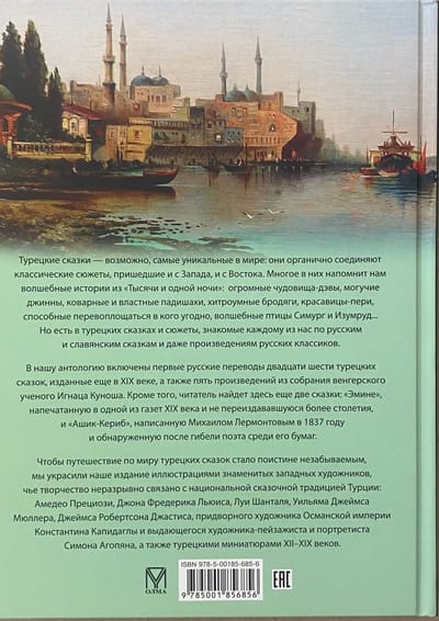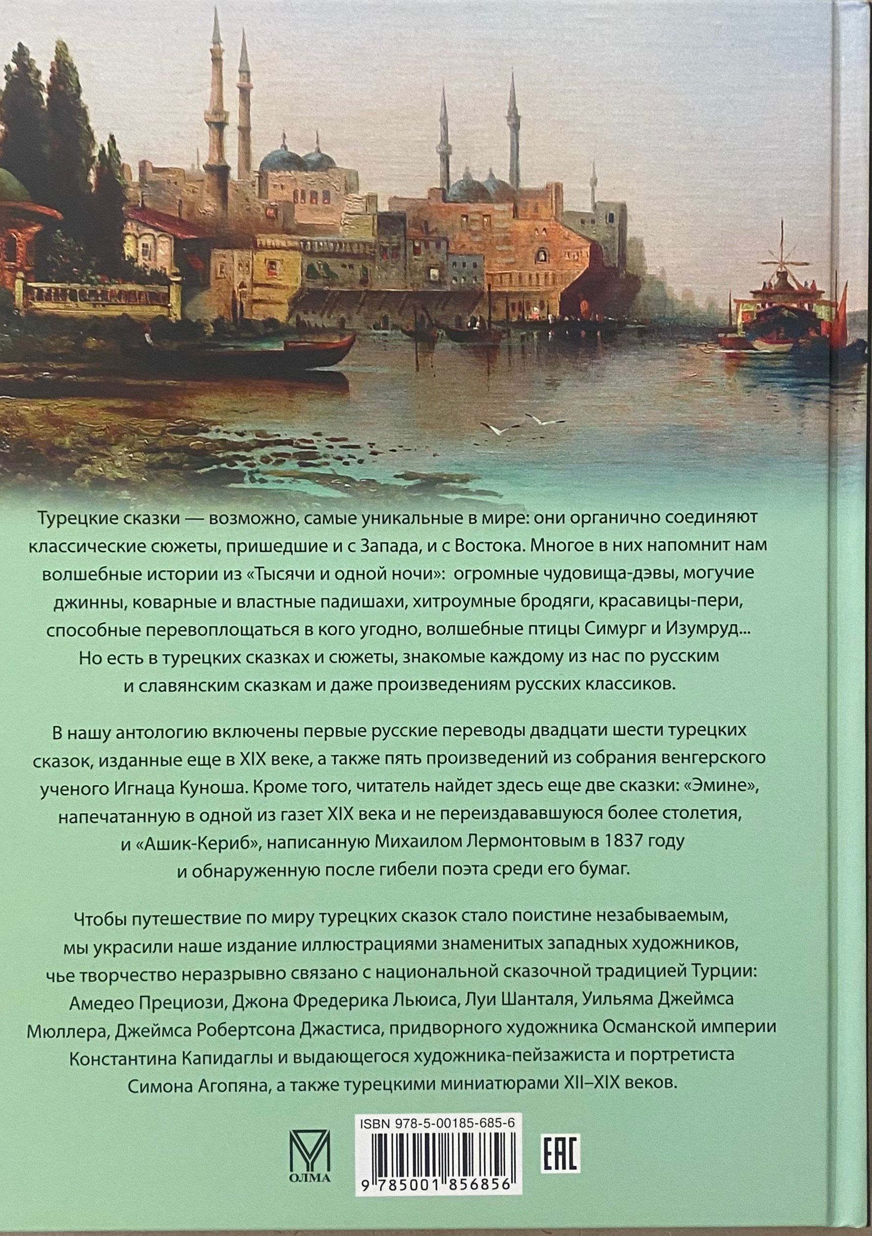 Турецкие сказки — возможно, самые уникальные в мире: они органично соединяют классические сюжеты, пришедшие и с Запада, и с Востока. Многое в них напомнит нам волшебные истории из «Тысячи и одной ночи»: огромные чудовища-дэвы, могучие джинны, коварные и властные падишахи, хитроумные бродяги, красавицы-пери, способные перевоплощаться в кого угодно, волшебные птицы Симург и Изумруд… Но есть в турецких сказках и сюжеты, знакомые каждому из нас по русским и славянским сказкам и даже произведениям русских классиков.