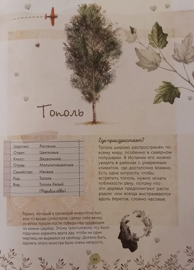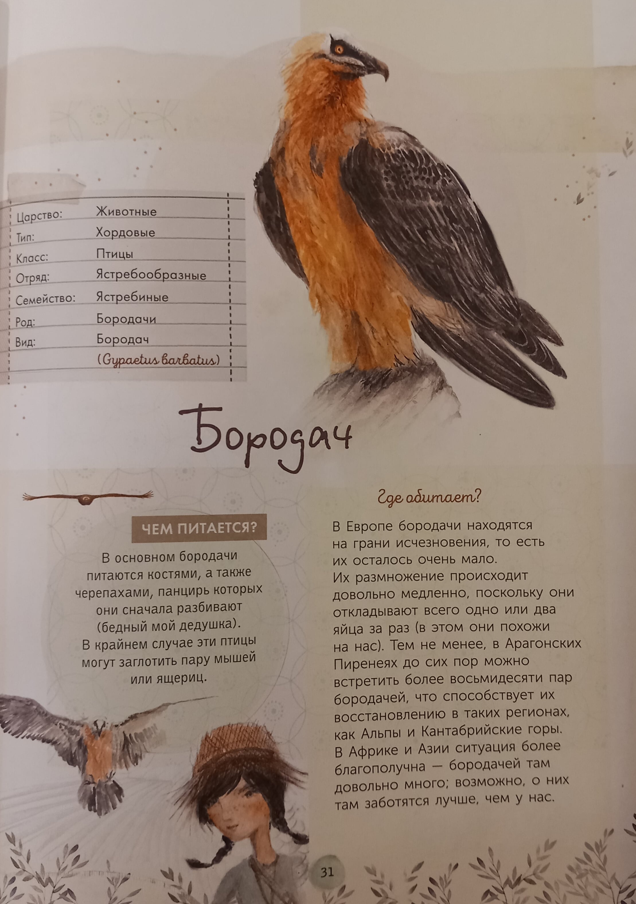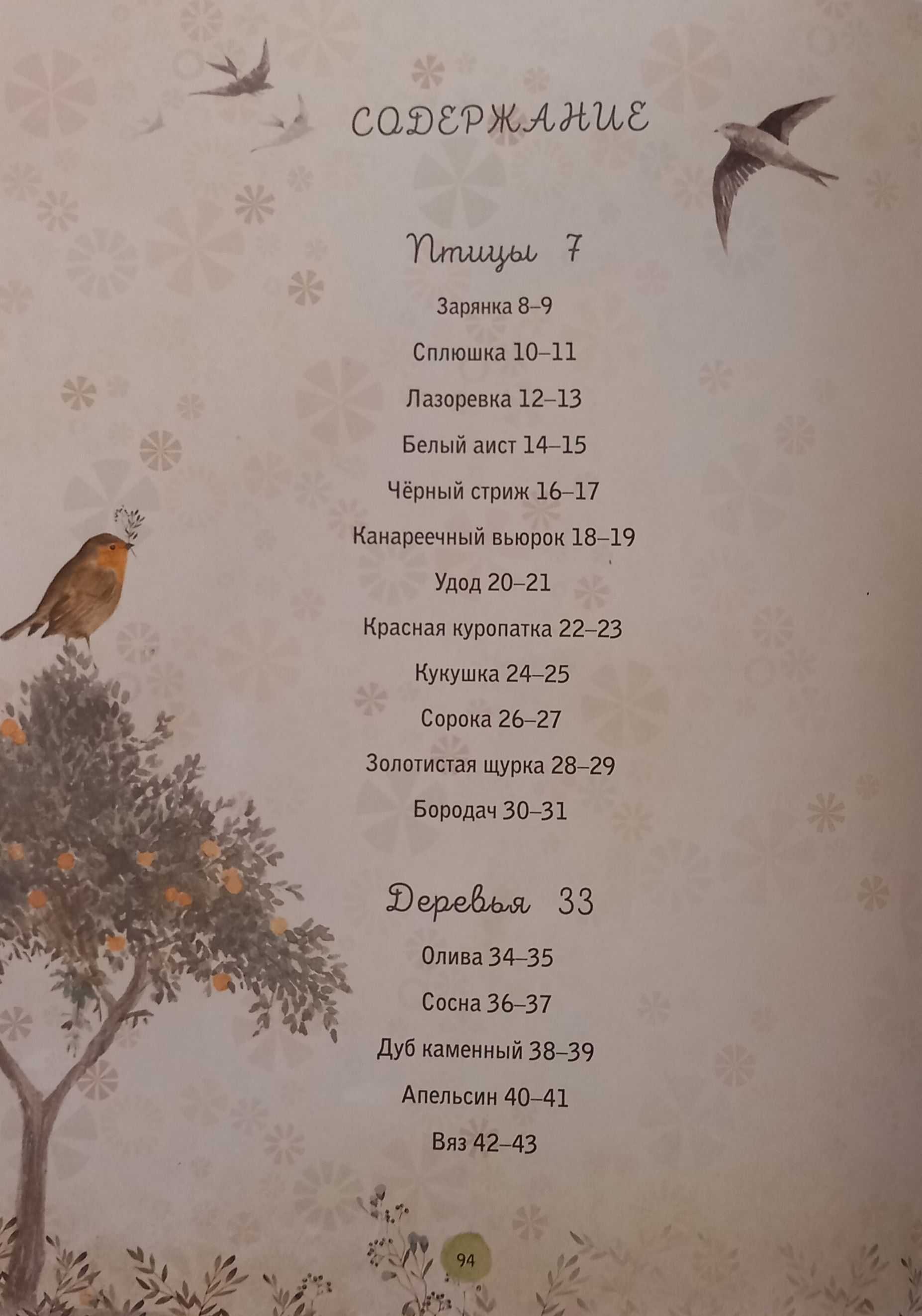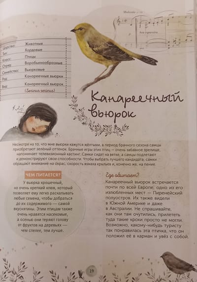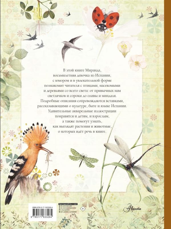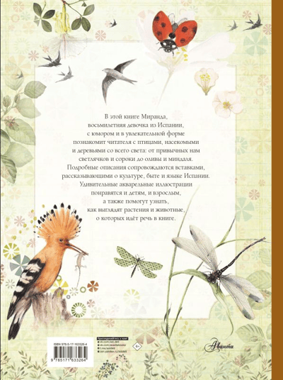 В этой книге Миранда, восьмилетняя девочка из Испании, с юмором и в увлекательной форме познакомит читателя с птицами, насекомыми и деревьями со всего света: от привычных нам светлячков и сороки до оливы и миндаля. Подробные описания сопровождаются вставками, рассказывающими о культуре, быте и языке Испании. Удивительные акварельные иллюстрации понравятся и детям, и взрослым, а также помогут узнать, как выглядят растения и животные, о которых идёт речь в книге.