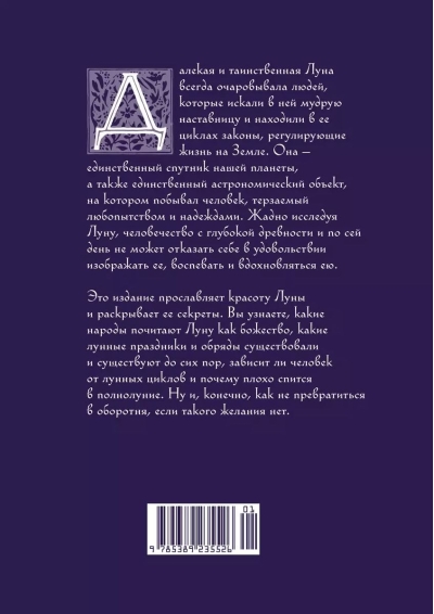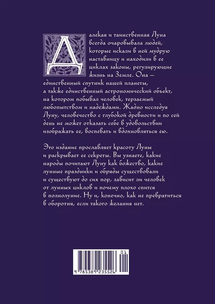 Далекая и таинственная Луна всегда очаровывала людей, которые искали в ней мудрую наставницу и находили в ее циклах законы, регулирующие жизнь на Земле. Она — единственный спутник нашей планеты, а также единственный астрономический объект, на котором побывал человек, терзаемый любопытством и надеждами. Жадно исследуя Луну, человечество с глубокой древности и по сей день не может отказать себе в довольствии изображать ее, воспевать и вдохновляться ею. Это издание прославляет красоту Луны и раскрывает ее секреты. Вы узнаете, какие народы почитают Луну как божество, какие лунные праздники и обряды существовали и существуют до сих пор, зависит ли человек от лунных циклов и почему плохо спится в полнолуние. Ну и, конечно, как не превратиться в оборотня, если такого желания нет.