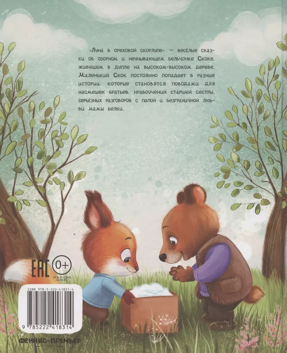 «Луна в ореховой скорлупе» - весёлые сказки об озорном и неунывающем бельчонке Скоке, живущем в дупле на высоком-высоком дереве. Маленький Скок постоянно попадает в разные истории, которые становятся поводами для насмешек братьев, нравоучений старшей сестры, серьёзных разговоров с папой и безграничной любви мамы белки.