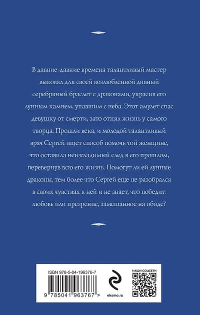 В давние-давние времена талантливый мастер выковал для своей возлюбленной дивный серебряный браслет с драконами, украсив его лунным камнем, упавшим с неба. Этот амулет спас девушку от смерти, зато отнял жизнь у самого творца. Прошли века, и молодой талантливый врач Сергей ищет способ помочь той женщине, что оставила неизгладимый след в его прошлом, перевернув всю его жизнь. Помогут ли ей лунные драконы, тем более что Сергей еще не разобрался в своих чувствах к ней и не знает, что победит: любовь или презрение, замешанное на обиде.