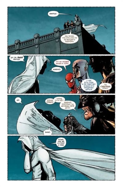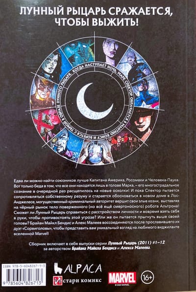 Едва ли можно найти союзников лучше Капитана Америка, Росомахи и Человека-Паука. Вот только беда в том, что все они находятся лишь в голове Марка, — его многострадальное сознание в очередной раз расщепилось на новые осколки! И пока Спектор пытается сопротивляться собственному разуму и старается обосноваться в новом доме в ЛосАнджелесе, могущественный криминальный авторитет вершит свои злые козни, выставляя на чёрный рынок тело поверженного (но всё ещё смертоносного) робота Альтрона! Сможет ли Лунный Рыцарь справиться с расстройством личности и вовремя взять себя в руки, чтобы противостоять этой угрозе? Или же он пытается прыгнуть выше своей головы? Брайан Майкл Бендис и Алекс Малеев воссоединяются после прославившего их дуэт Сорвиголовы, чтобы представить вам уникальный взгляд на любимого виджиланте вселенной Marvel!