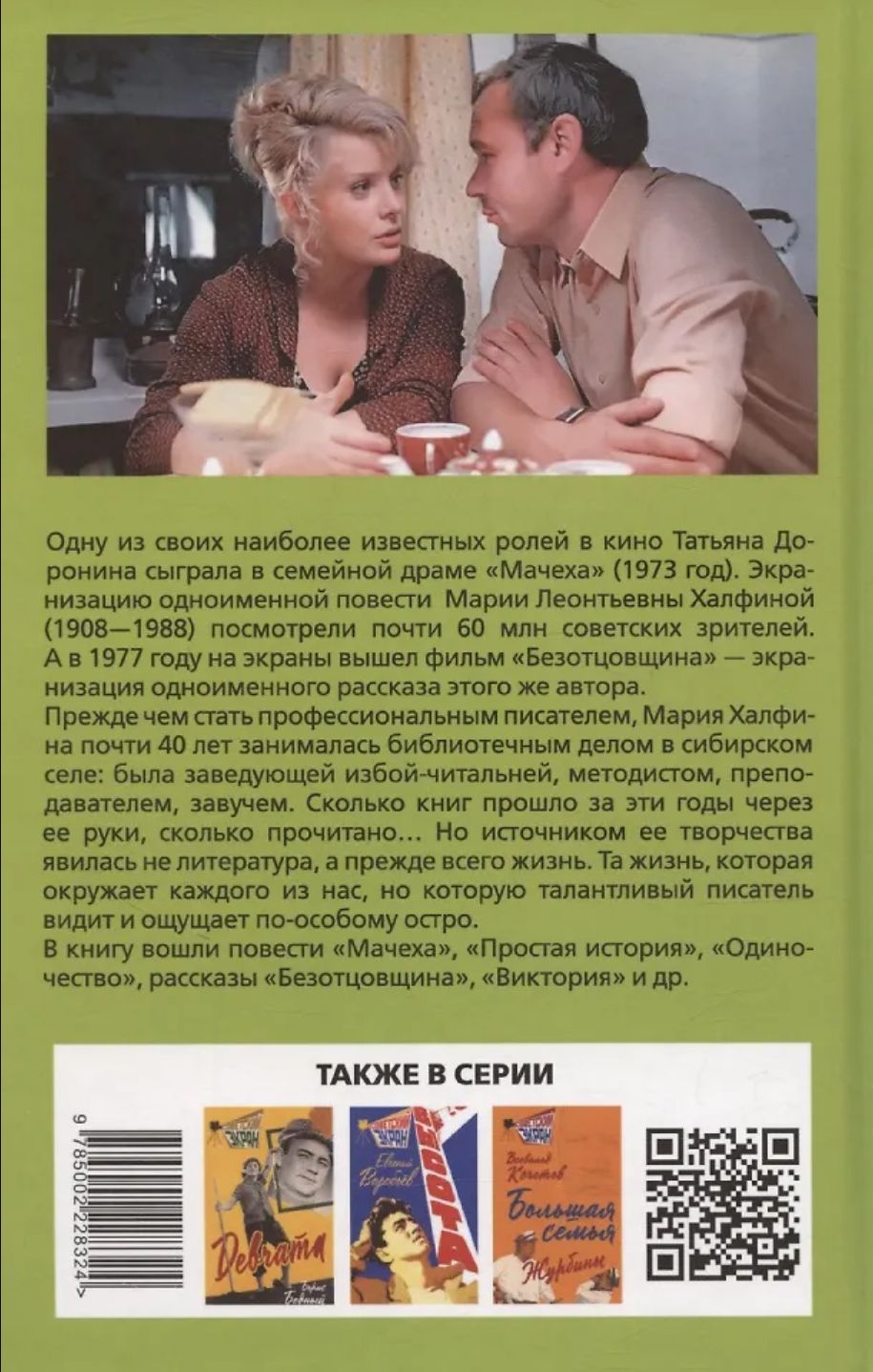 Одну из своих наиболее известных ролей в кино Татьяна Доронина сыграла в семейной драме «Мачеха» (1973 год). Экранизацию одноименной повести Марии Леонтьевны Халфиной (1908–1988) посмотрели почти 60 млн советских зрителей. А в 1977 году на экраны вышел фильм «Безотцовщина» - экранизация одноименного рассказа этого же автора. Прежде чем стать профессиональным писателем, Мария Халфина почти 40 лет занималась библиотечным делом в сибирском селе: была заведующей избой-читальней, методистом, преподавателем, завучем. Сколько книг прошло за эти годы через ее руки, сколько прочитано… Но источником ее творчества явилась не литература, а прежде всего жизнь. Та жизнь, которая окружает каждого из нас, но которую талантливый писатель видит и ощущает по-особому остро. В книгу вошли повести «Мачеха», «Простая история», «Одиночество», рассказы «Безотцовщина», «Виктория» и др.