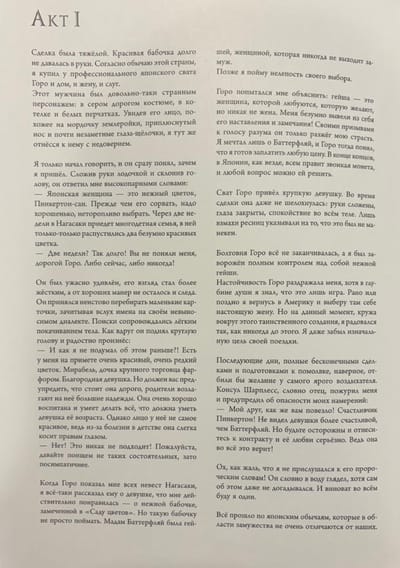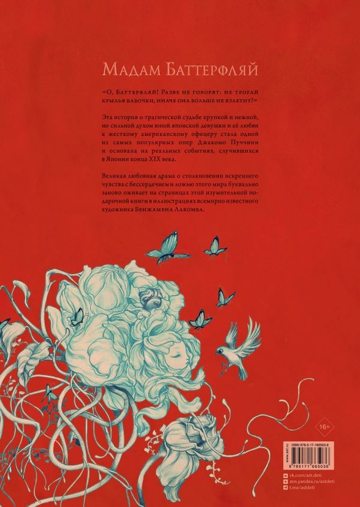 Эта история о трагической судьбе хрупкой и нежной, но сильной духом юной японской девушки и её любви к жесткому американскому офицеру стала одной из самых популярных опер Джакомо Пуччини и основана на реальных событиях, случившихся в Японии конца XIX века. Великая любовная драма о столкновении искреннего чувства с бессердечием и ложью этого мира буквально заново оживает на страницах этой изумительной подарочной книги в иллюстрациях всемирно известного художника Бенжамена Лакомба.