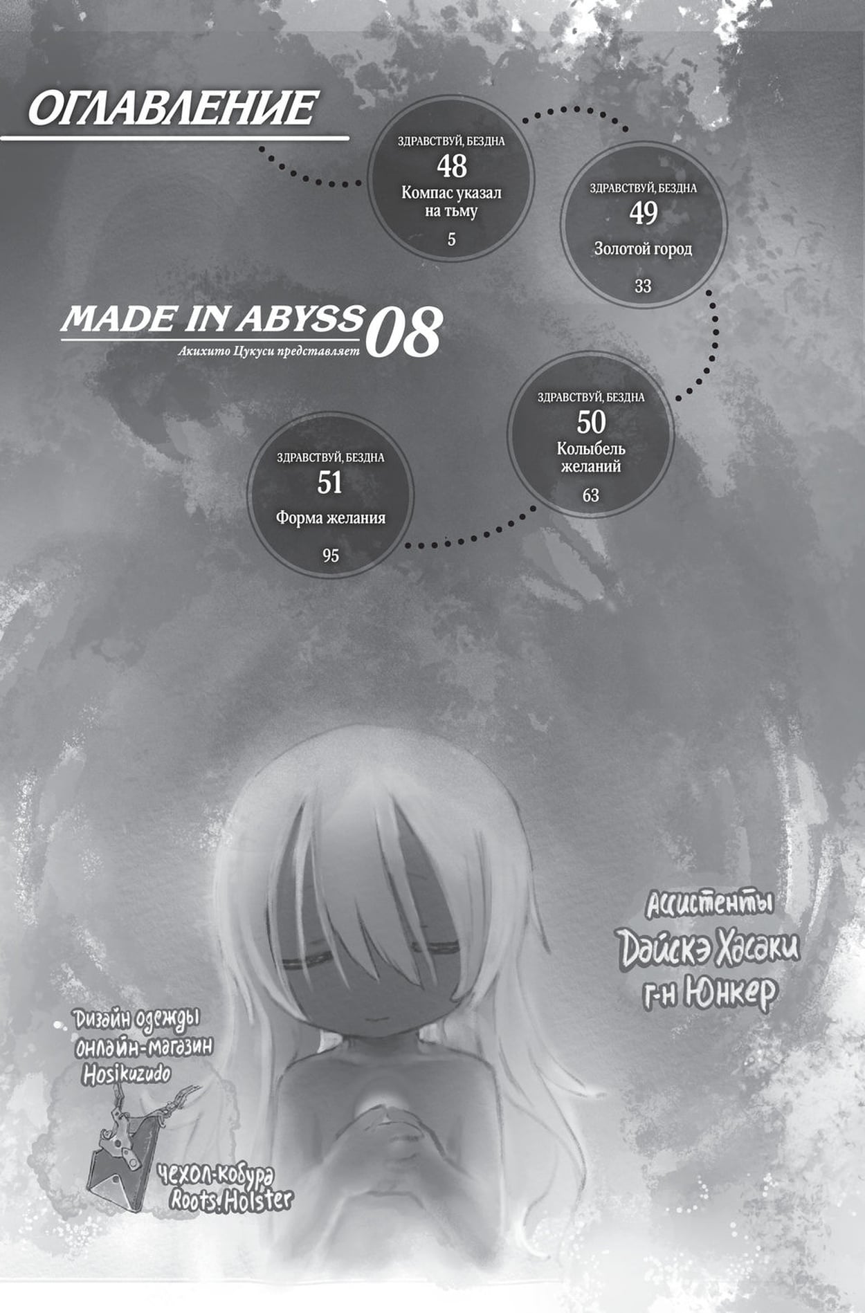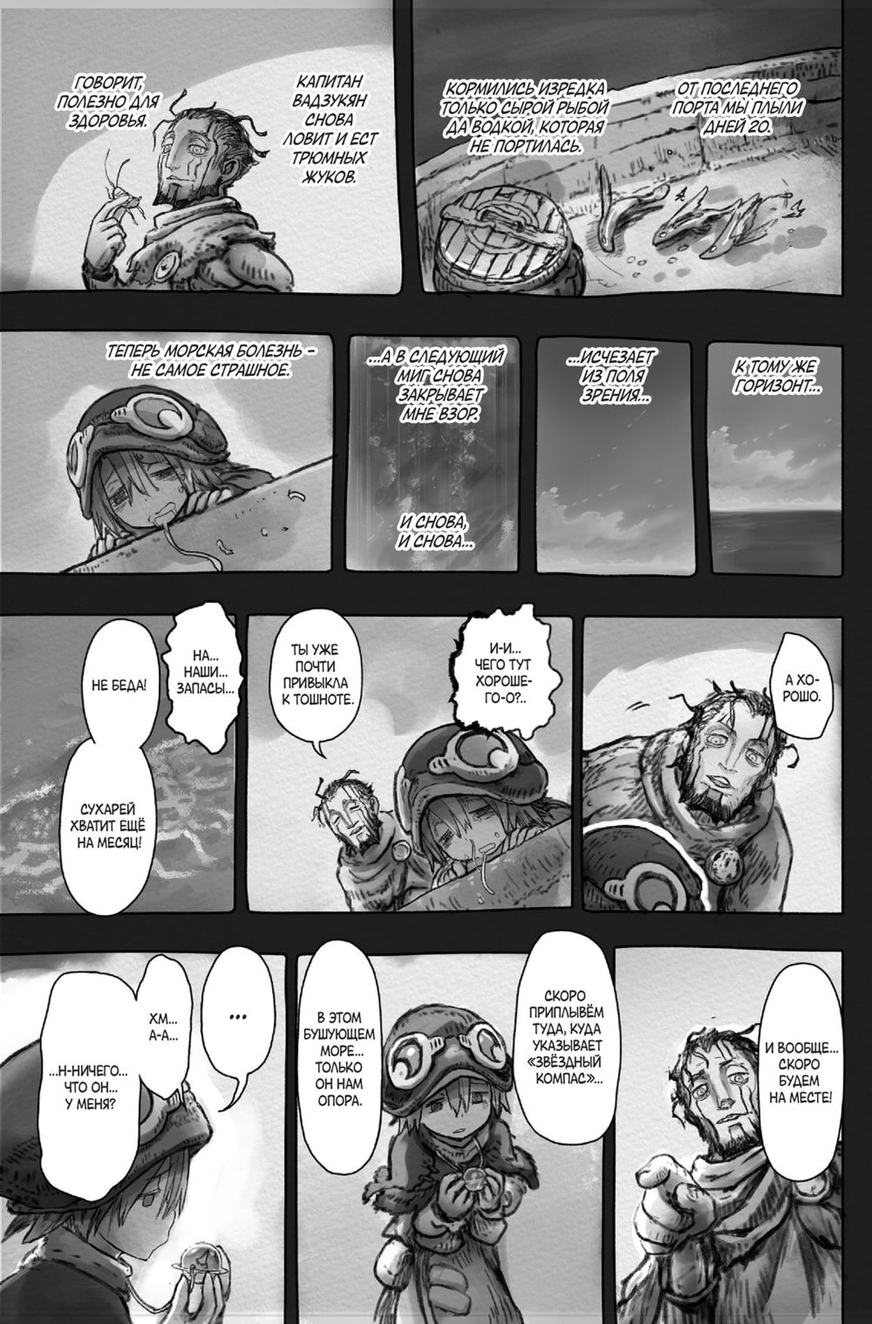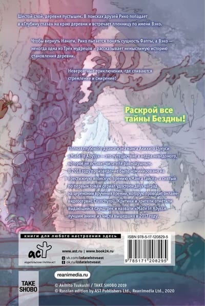 Шестой слой, деревня пустышек. В поисках друзей Рико попадает в «Глубину глаза» на краю деревни и встречает пленницу по имени Вэко. Чтобы вернуть Нанати, Рико пытается понять сущность Фапты, а Вэко — некогда одна из Трёх мудрецов — рассказывает немыслимую историю становления деревни. Невероятные приключения, где сливаются стремление и смирение — в восьмом томе!